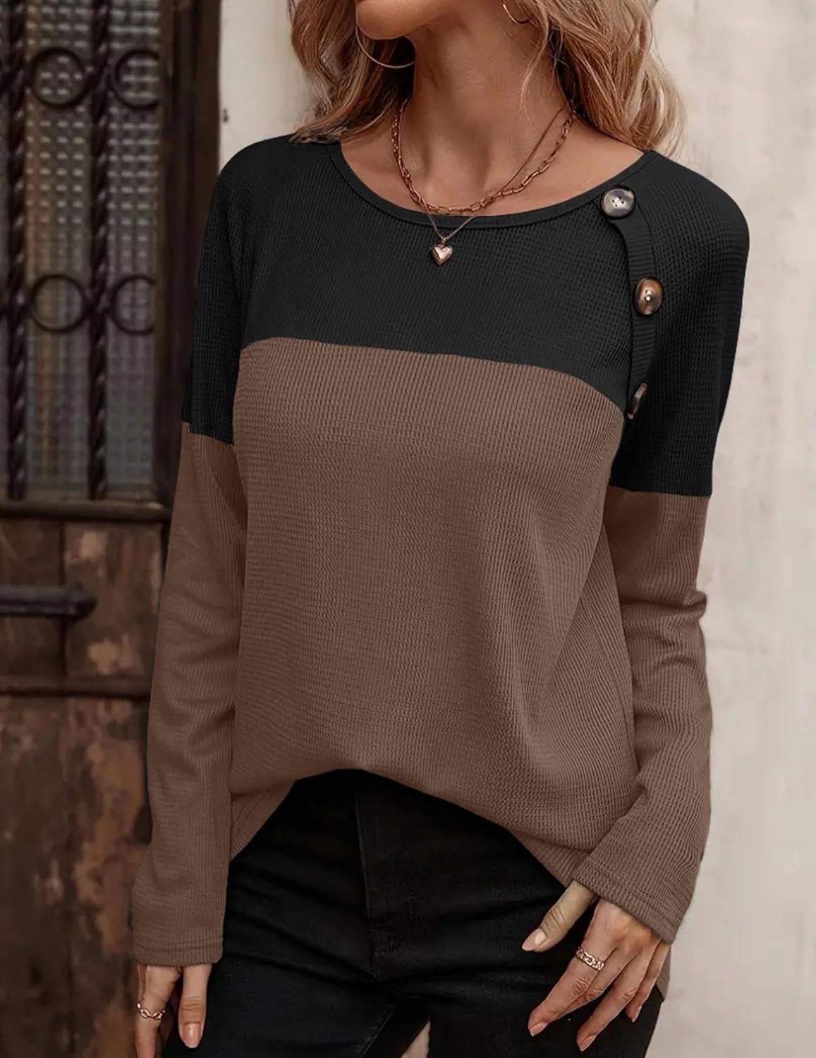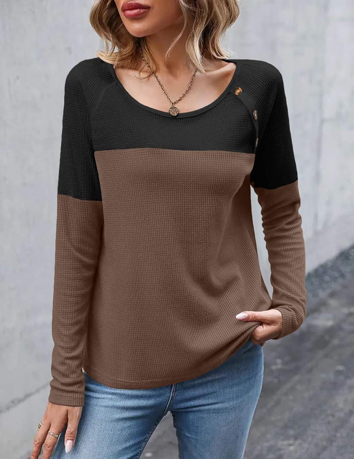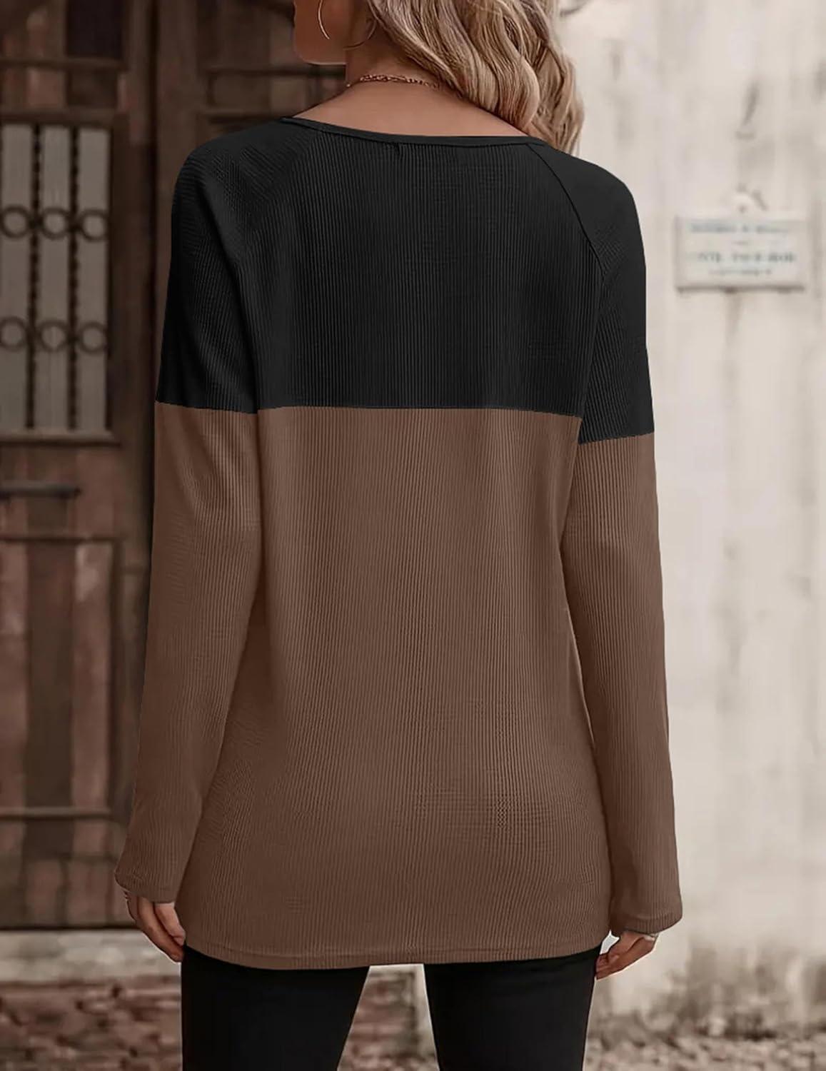 Zeagoo Women Waffle Knit Shirts Long Sleeve Colorblock Tee Button Detail Tunics(Brown)