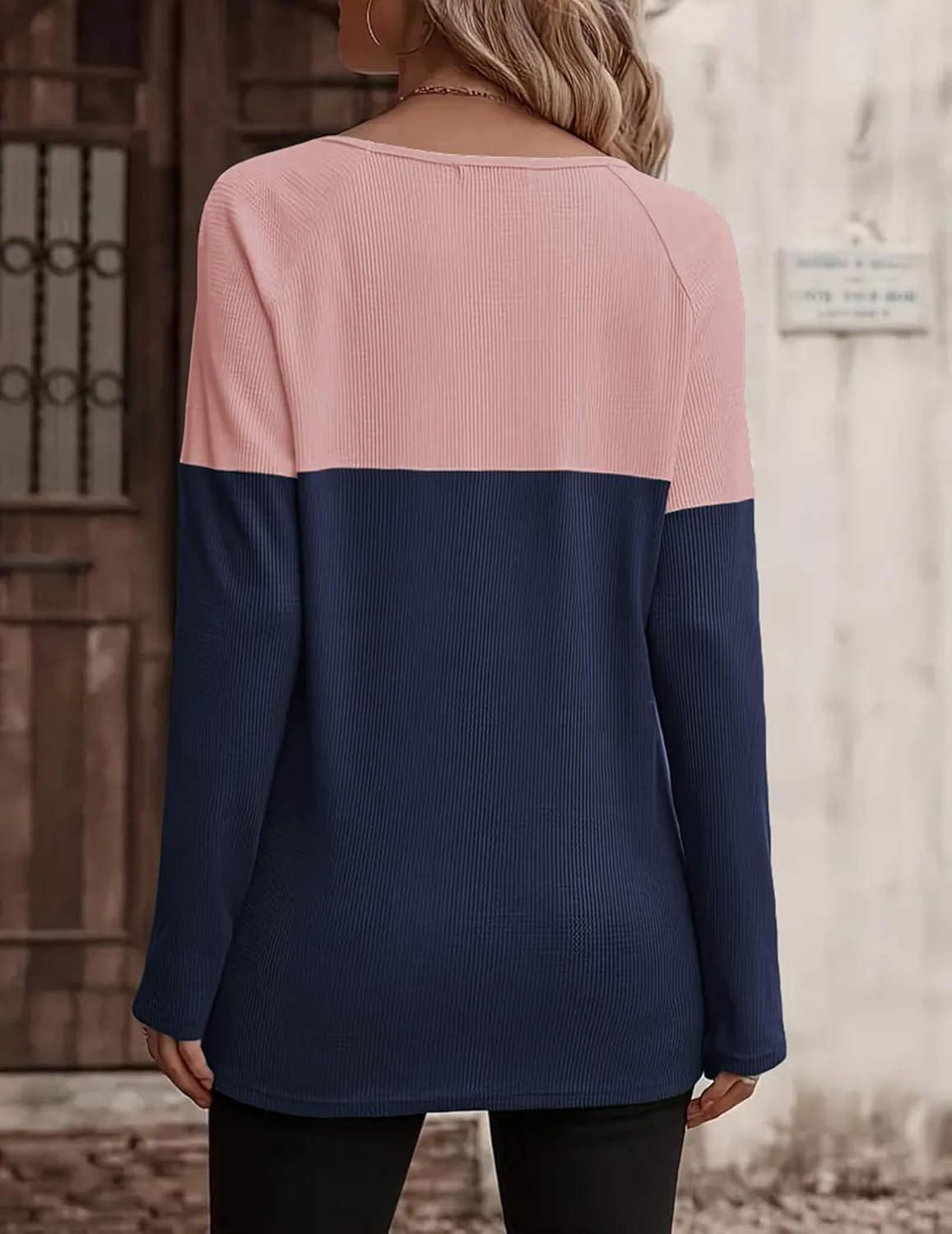 Zeagoo Women Waffle Knit Shirts Long Sleeve Colorblock Tee Button Detail Tunics(Pink+navy)