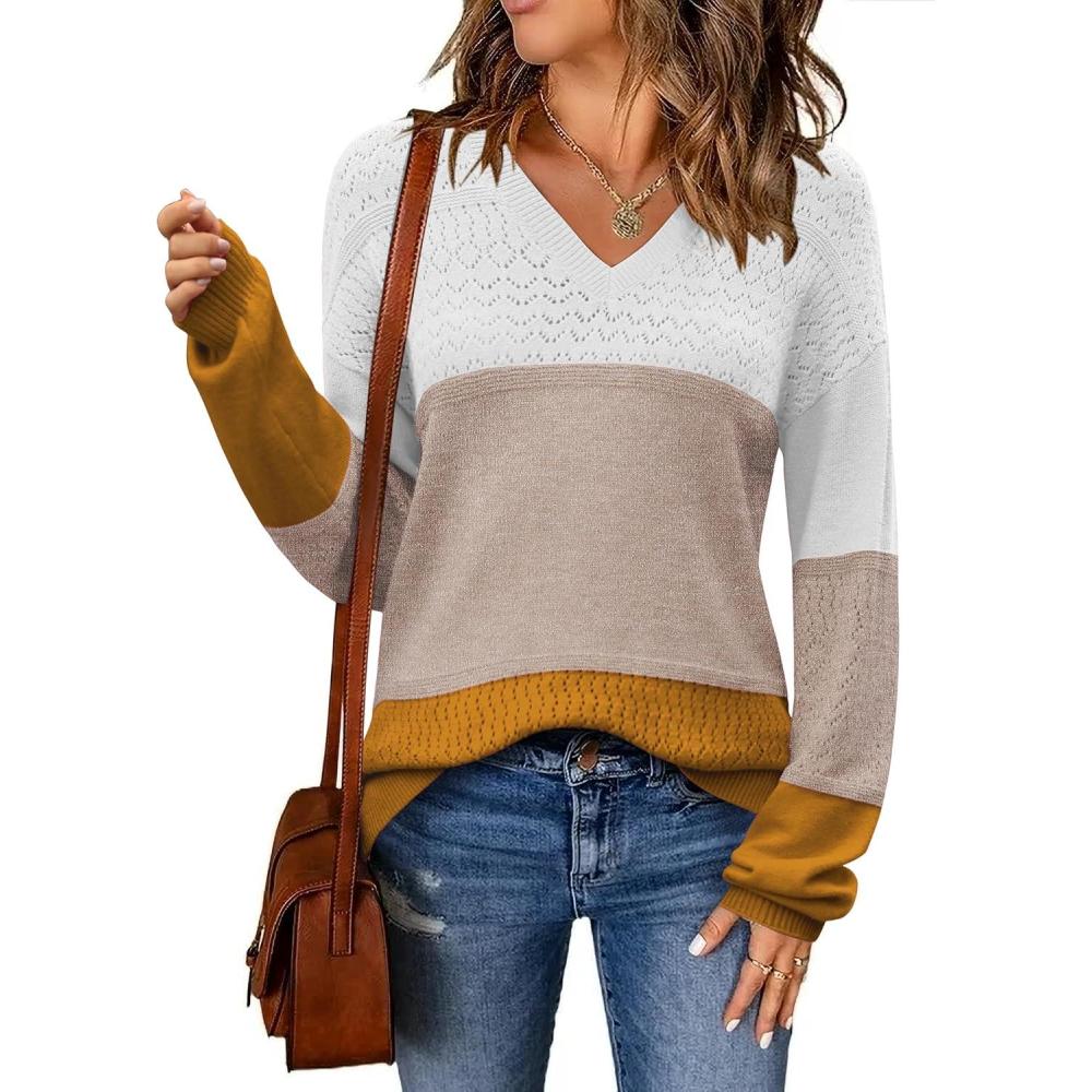Zeagoo Womens 2025 Fall Sweaters Casual Long Sleeve Ribbed Knit Pullover V Neck Lightweight Crochet Pullover Sweater Top(Colorblock 561)