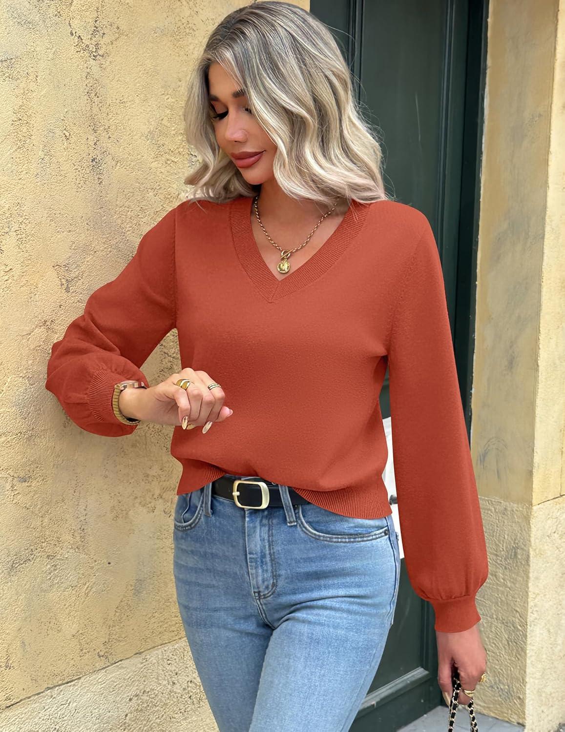 Zeagoo Women’s 2025 Fall V-Neck Cropped Sweater Trendy Long Latern Sleeve Ribbed Knit Pullover Crop Tops(Brick Red)