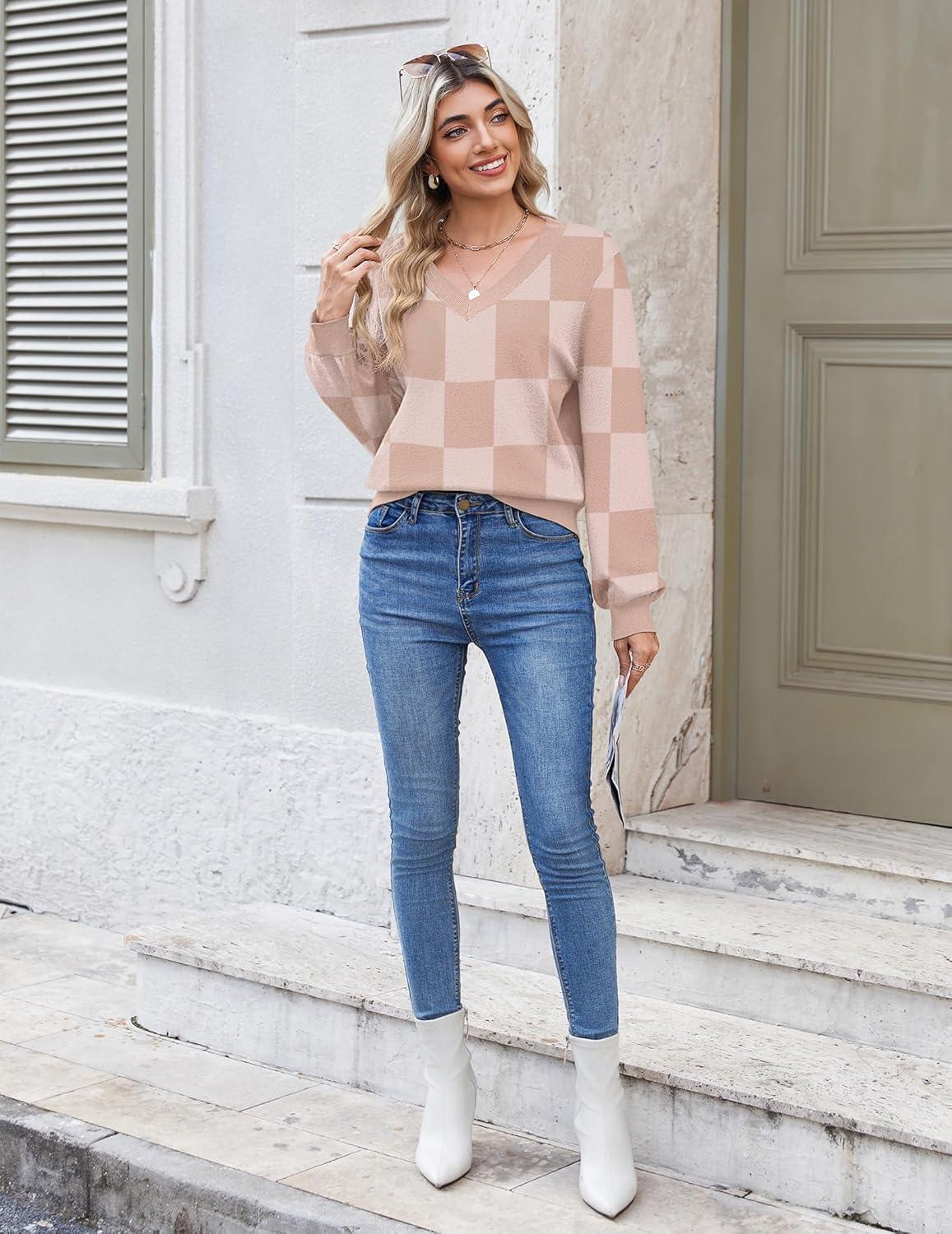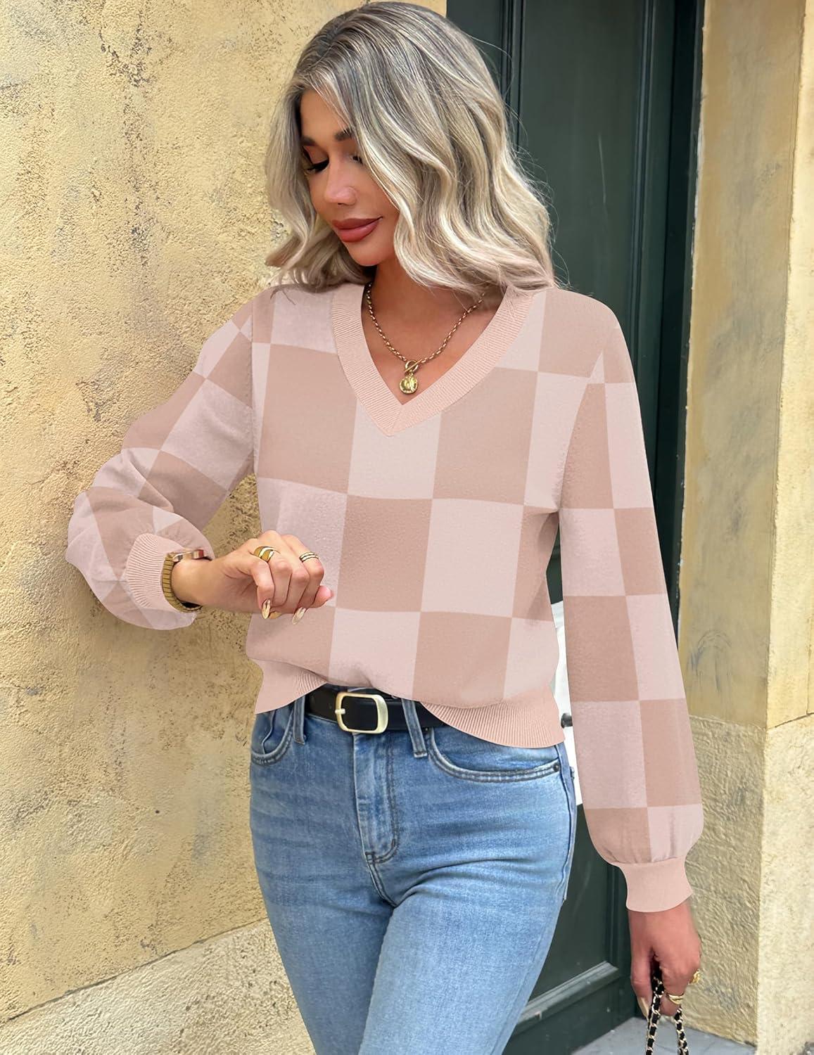 Zeagoo Women’s 2025 Fall V-Neck Cropped Sweater Trendy Long Latern Sleeve Ribbed Knit Pullover Crop Tops(Khakiplaid)