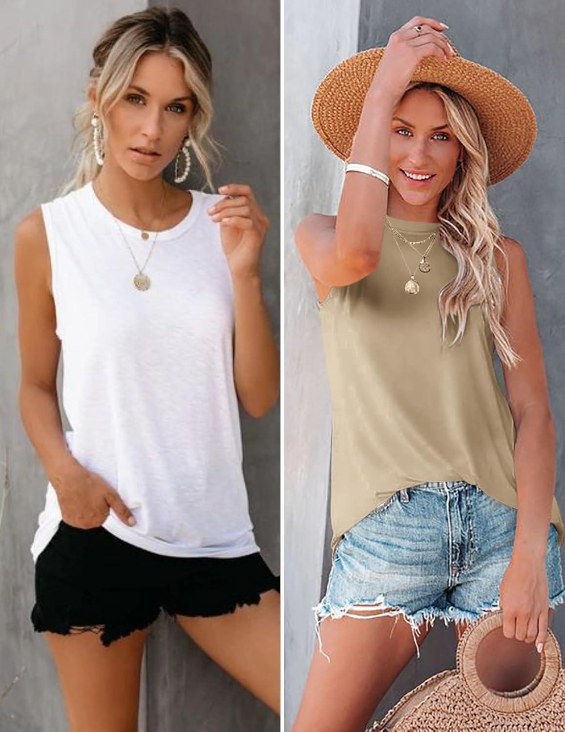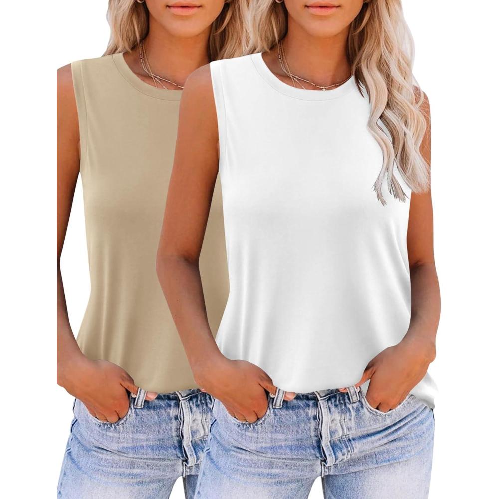 Zeagoo Womens 2025 Tank Tops Casual Crewneck Sleeveless T Shirts Loose Fit Summer Tunic Blouse(Khaki and White)