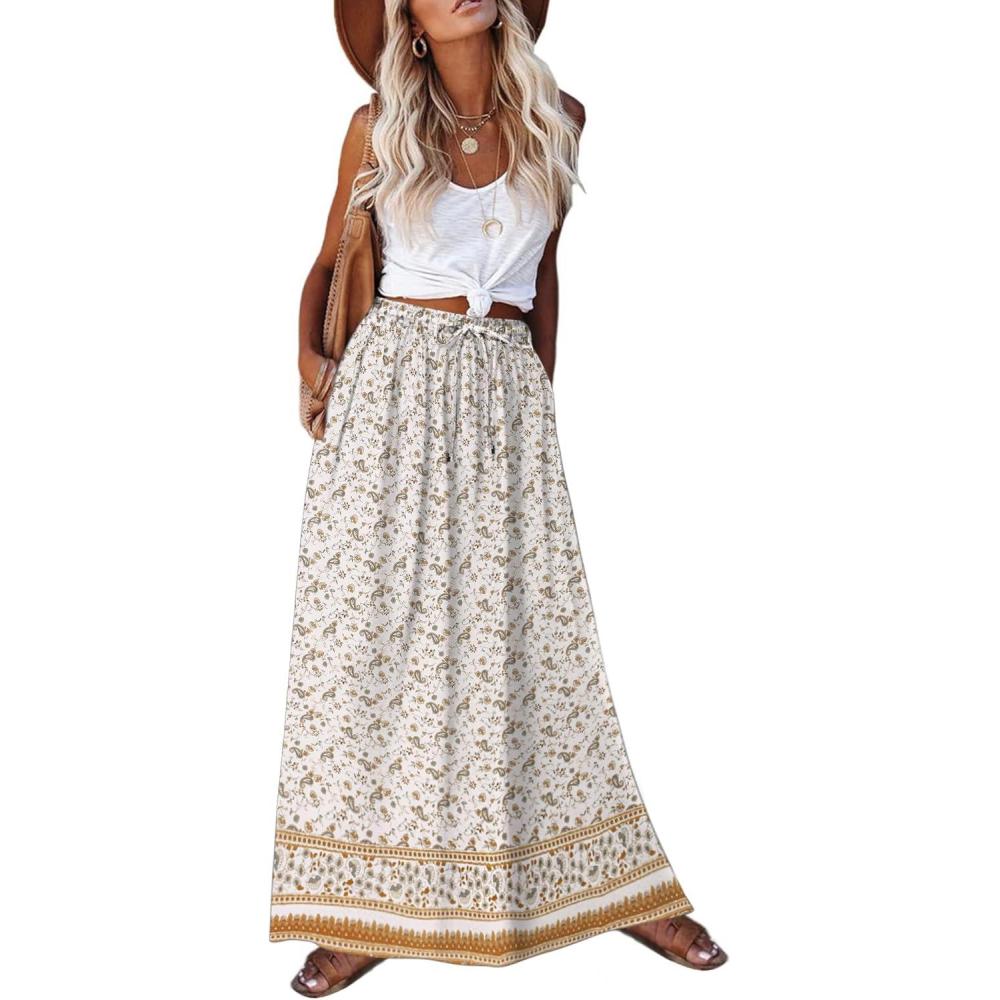 Zeagoo Women’s 2026 Boho Floral Skirt Casual Elastic High Waist Maxi Skirts Flowy A Line Beach Long Skirt with Side Pockets(White)