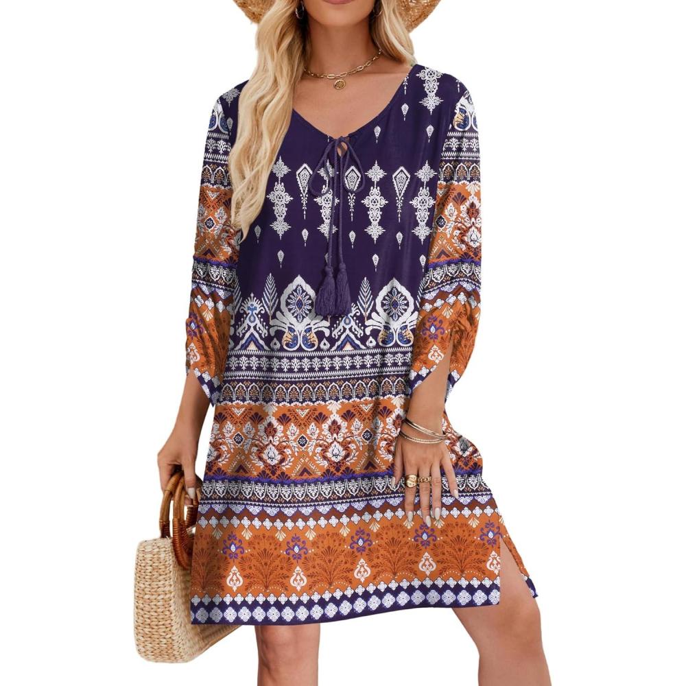 Zeagoo Womens Boho Dresses Casual Beach Summer Dress Tassel Tie Neck 3/4 Long Sleeve Mini Sundress 2026 Floral Print Cover Up(01 Navy)