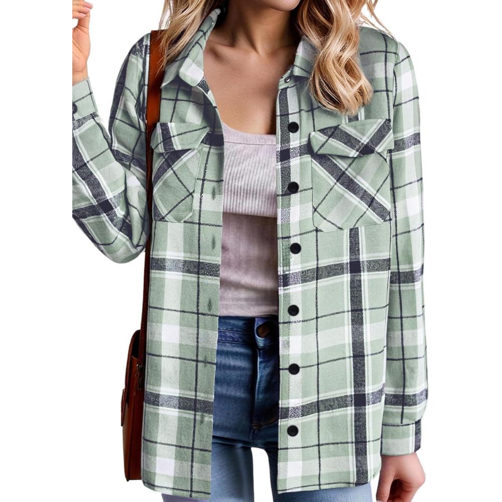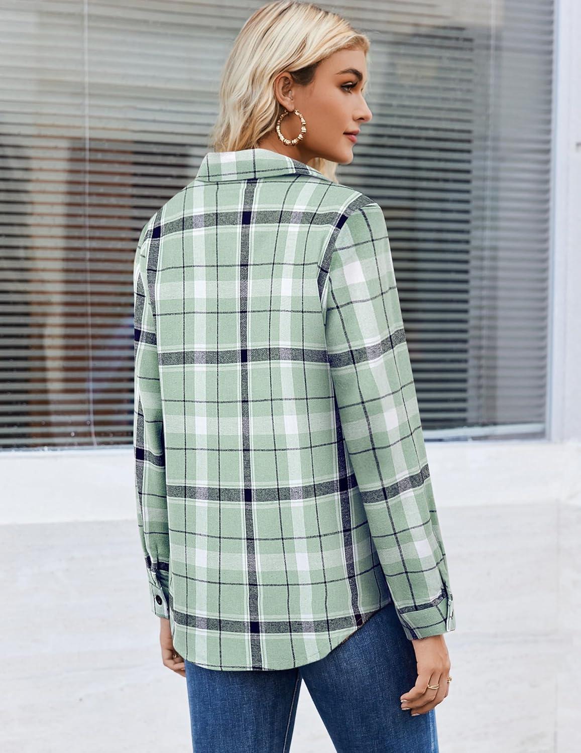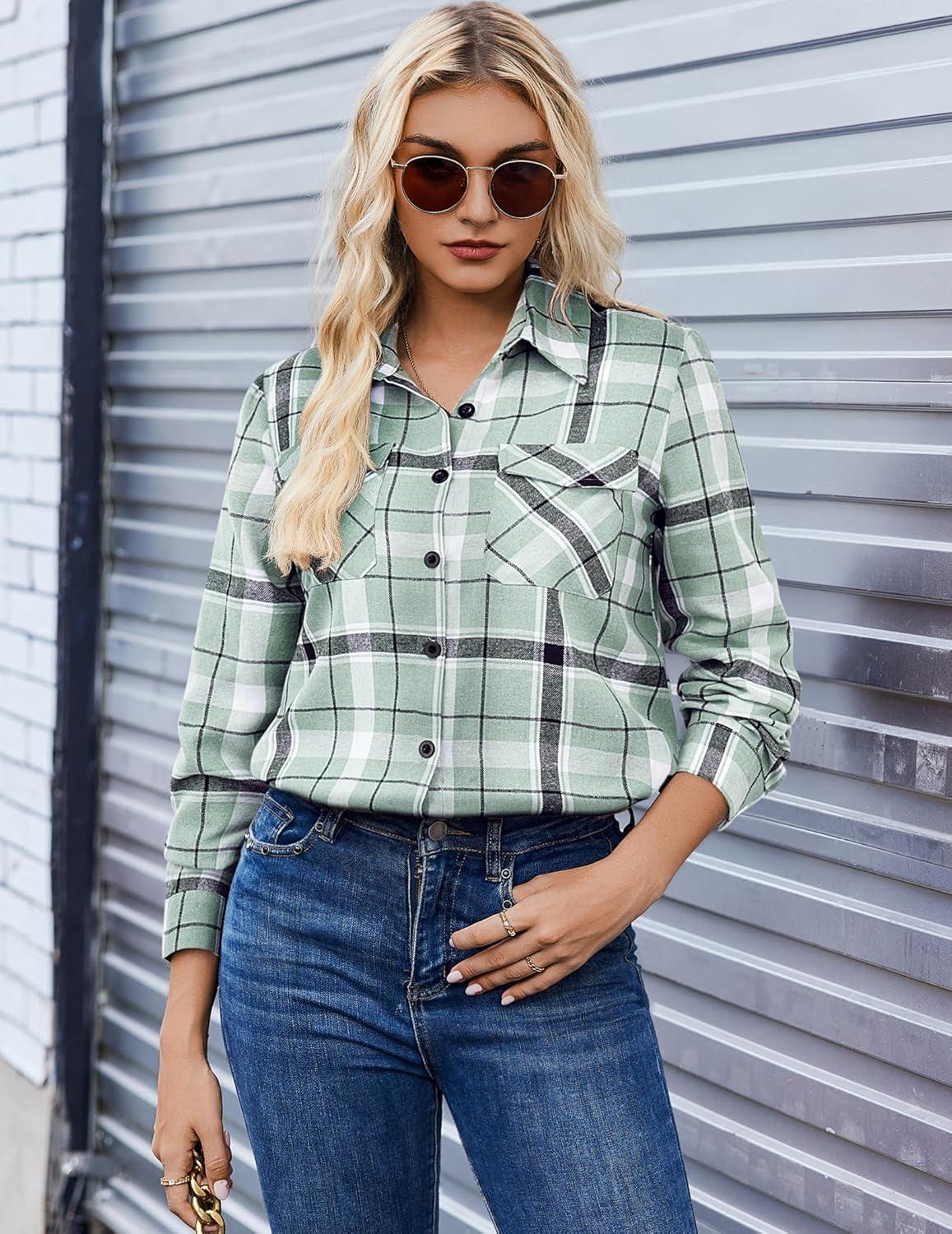 Zeagoo Womens Button Down Flannel Shirts Long Sleeve Plaid Blouses Lightweight Business Dressy Casual Top with Pockets(Light Green)