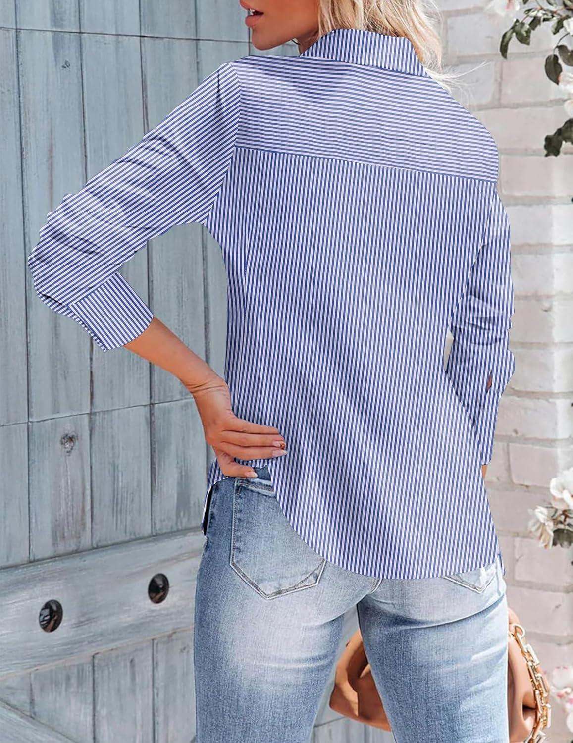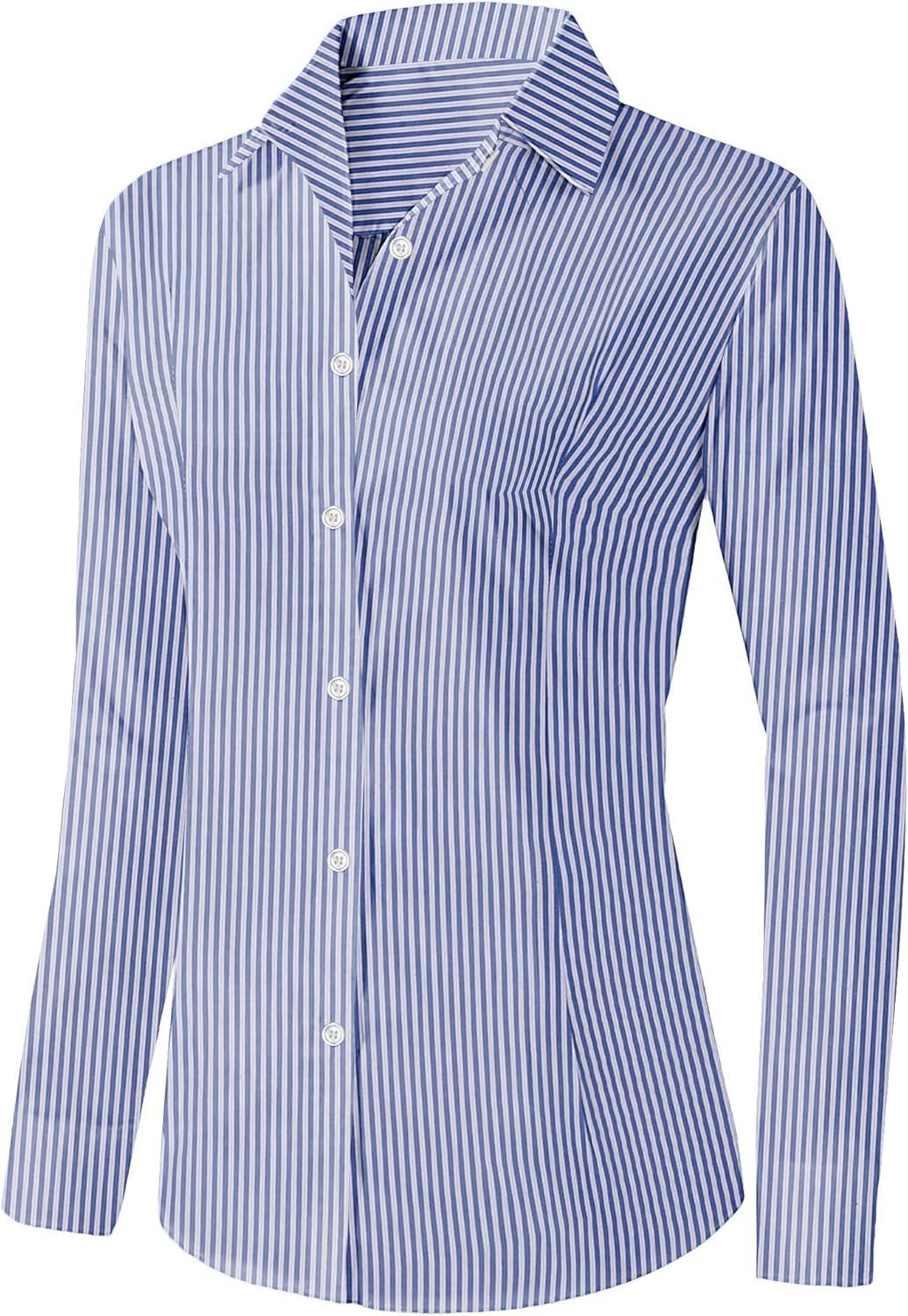 Zeagoo Womens Button Down Shirts Long Sleeve V Neck Tops Wrinkle Free Collared Work Office Solid Blouses Corset Tops(Dark Blue Stripe)