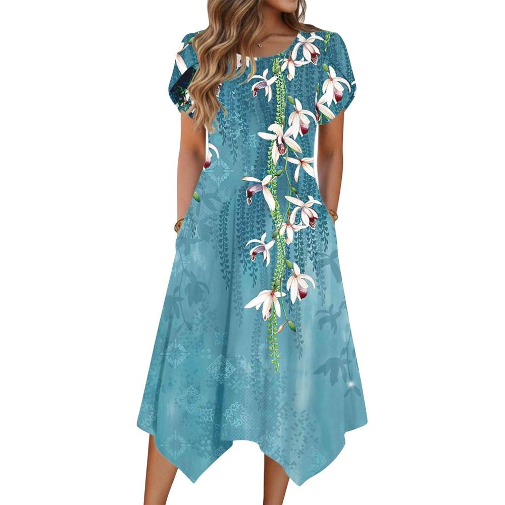 Zeagoo Womens Casual Dress for Summer Short Sleeve Loose Flowy Beach Dress with Pockets Hankerchief Flare Midi Sundress 2026(05 Blue)