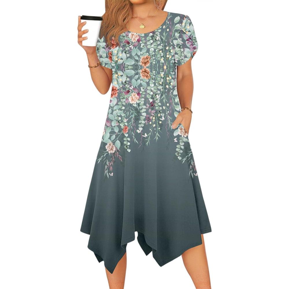 Zeagoo Womens Casual Dress for Summer Short Sleeve Loose Flowy Beach Dress with Pockets Hankerchief Flare Midi Sundress 2026(Grey Floral)