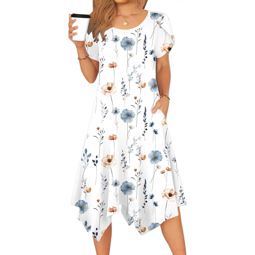 Zeagoo Womens Casual Dress for Summer Short Sleeve Loose Flowy Beach Dress with Pockets Hankerchief Flare Midi Sundress 2026(White)