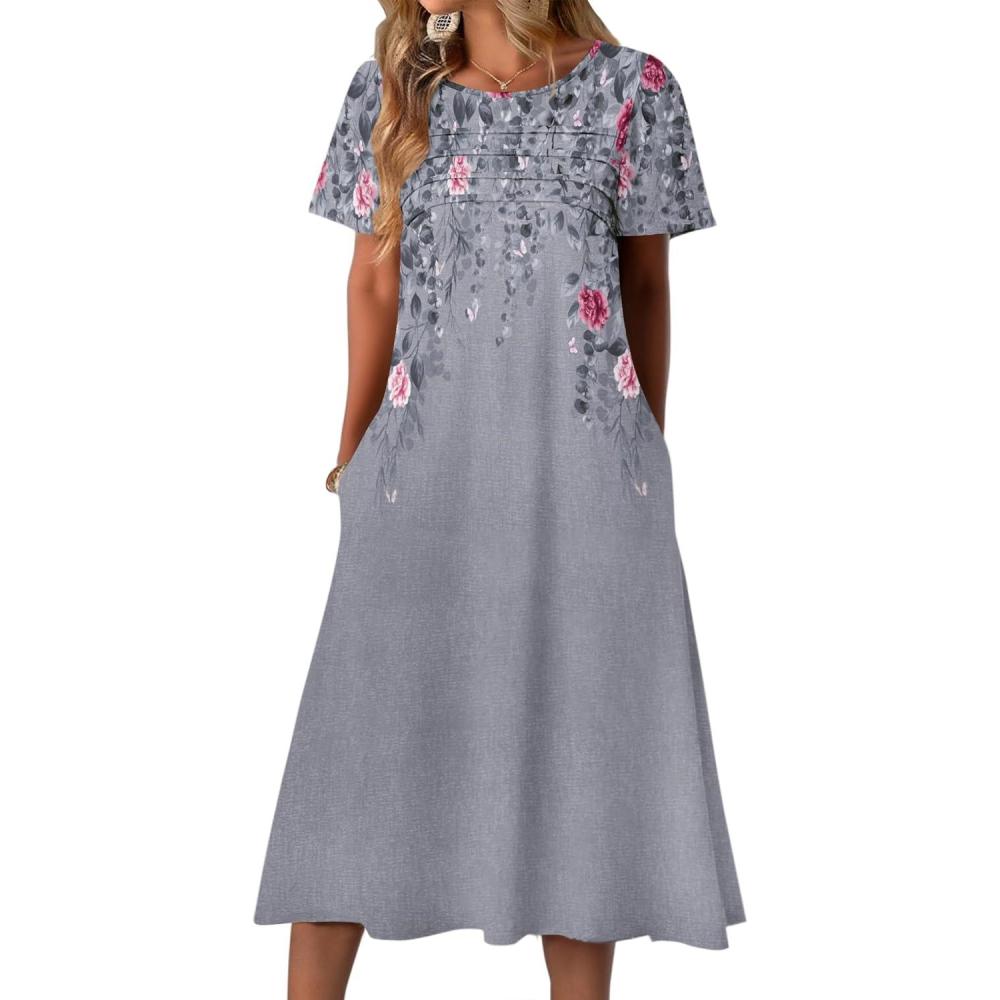 Zeagoo Womens Casual Dresses for Summer Short Sleeve Flare Midi Dress Loose Beach Sundress Pleated Front Dress with Pockets(Grey Floral)
