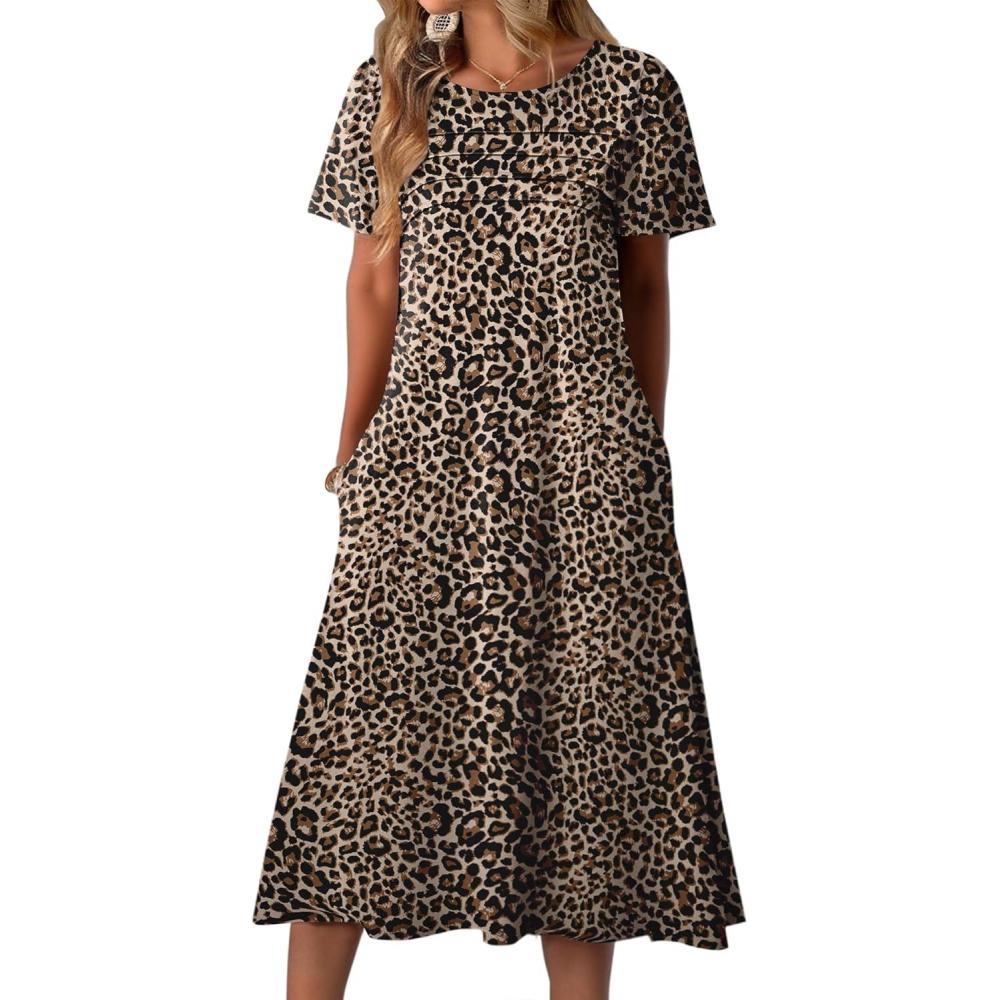 Zeagoo Womens Casual Dresses for Summer Short Sleeve Flare Midi Dress Loose Beach Sundress Pleated Front Dress with Pockets(Leopard Print)