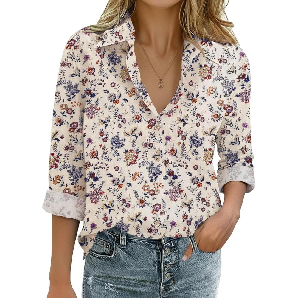 Zeagoo Womens Cotton Linen Button Down Shirts Loose Fit Long Sleeve Collared Blouse Casual V Neck Tops Outfits S-3XL(Xh51)