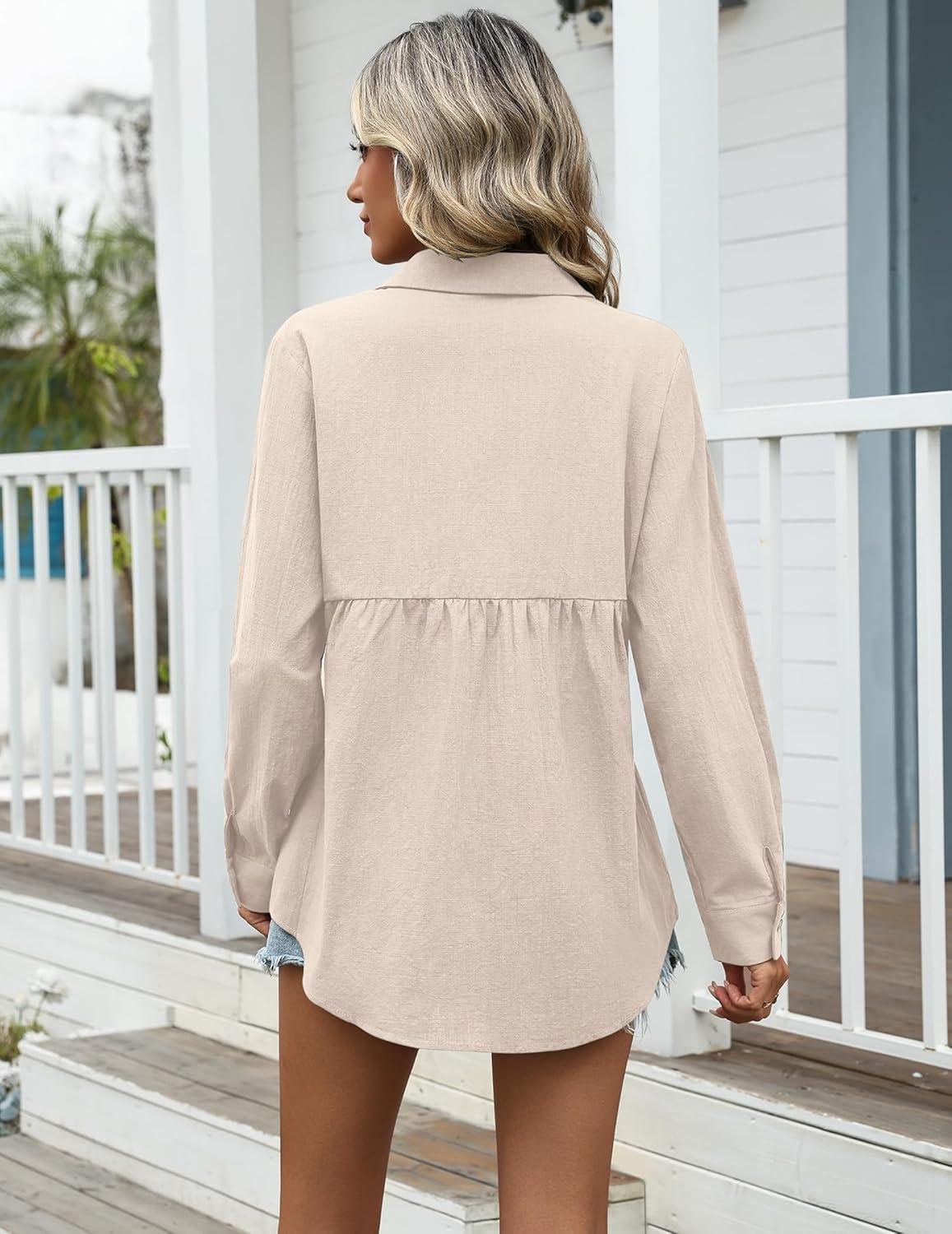 Zeagoo Womens Cotton Linen Button Down Shirts Loose Fit Long Sleeve Collared Blouse Casual V Neck Tops Outfits S-3XL(Z-champagne)