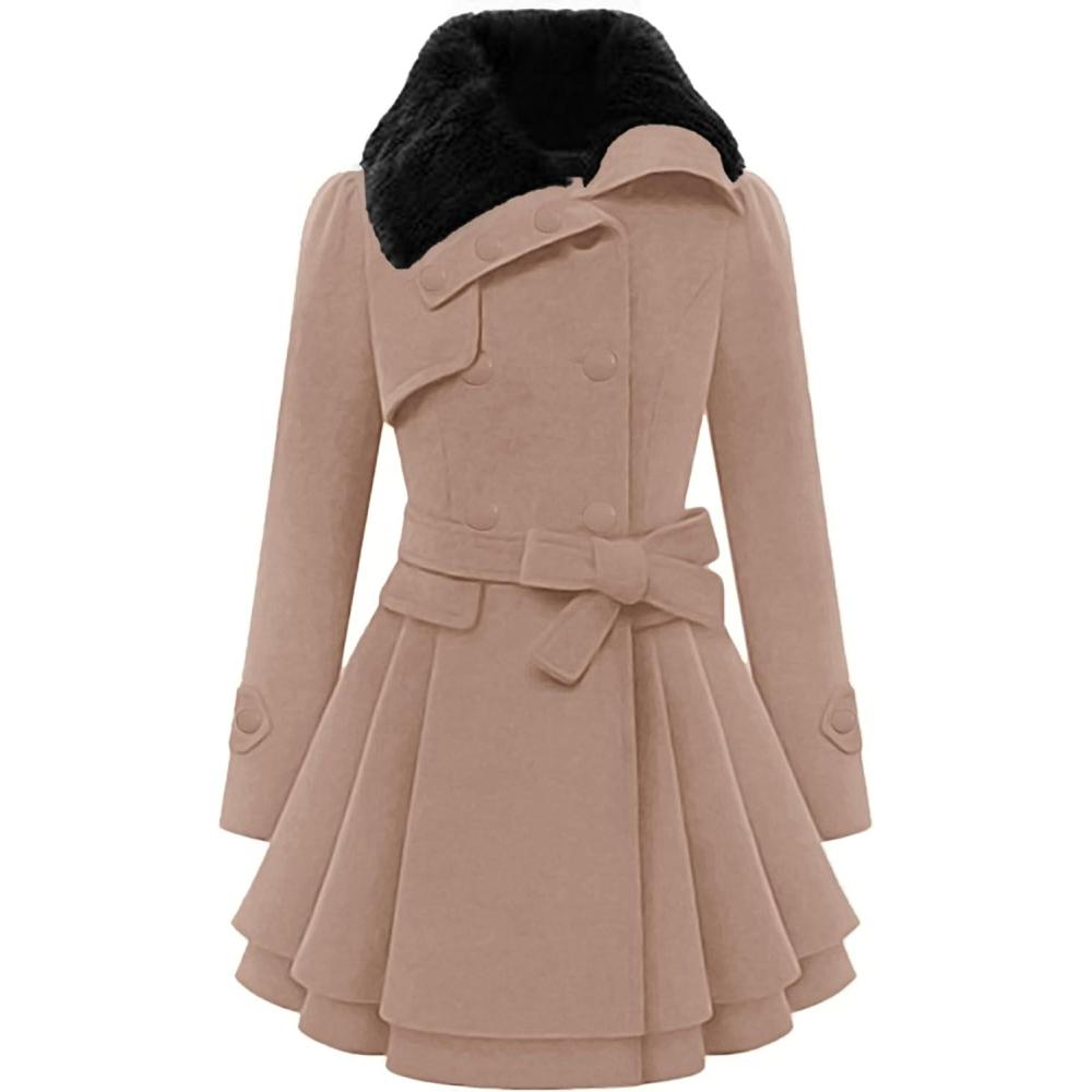 Zeagoo Women’s Fashion Faux Fur Lapel Double-Breasted Thick Wool Trench Coat Winter Warm Jacket S-2XL(New_khaki)