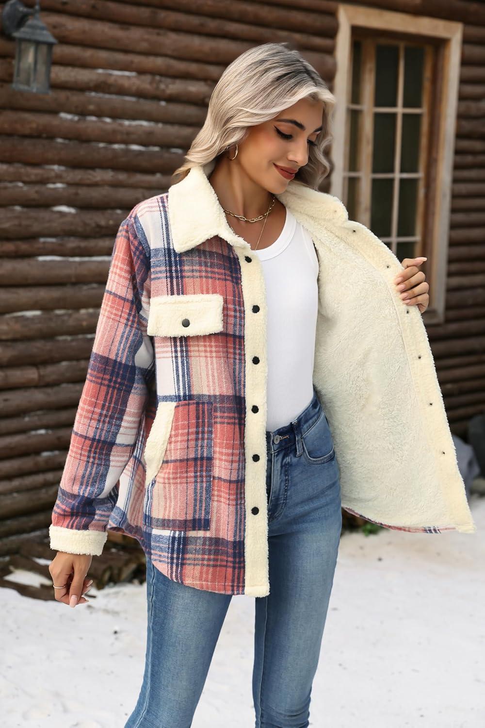 Zeagoo Womens Flannel Jacket Fleece Lined Shacket Fall Outfits Plaid Sherpa Button Down Cozy Warm Winter Coat S-XXL(Pink (Slim Fit a Size Up for Relaxed Fit))