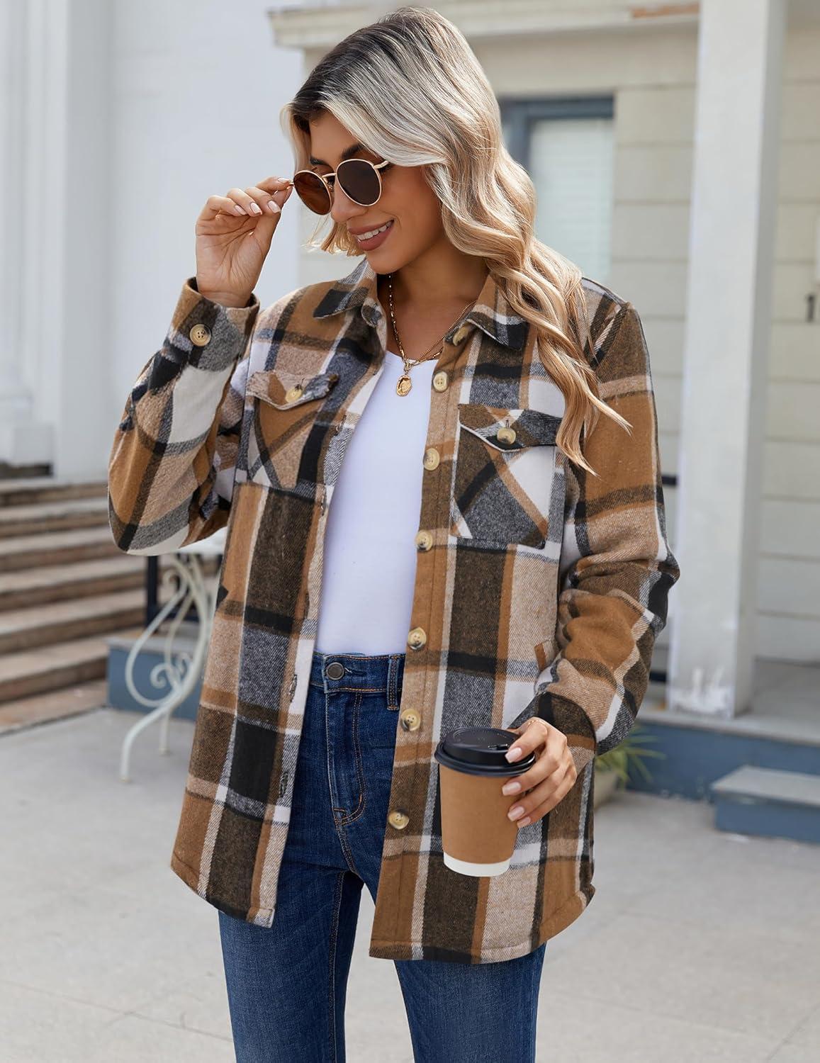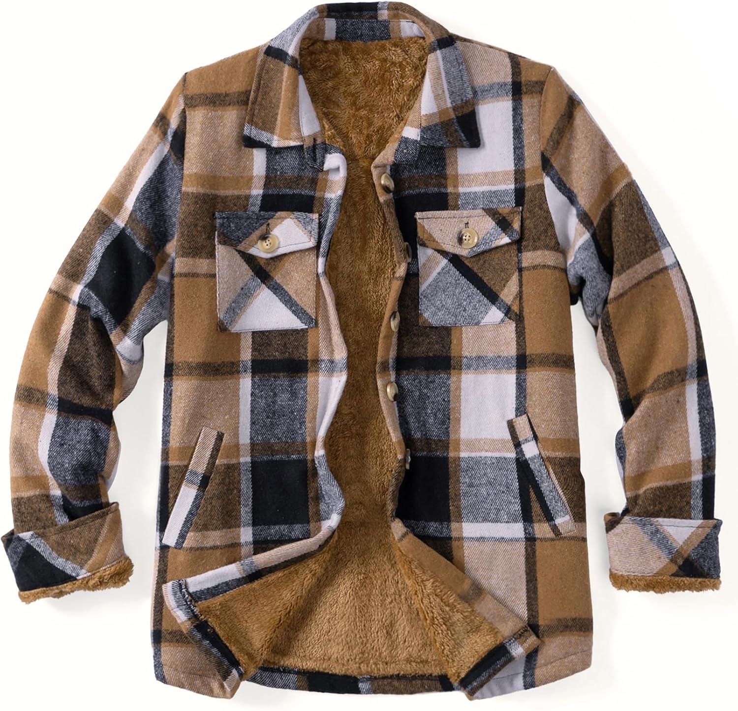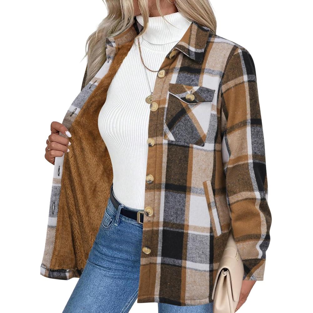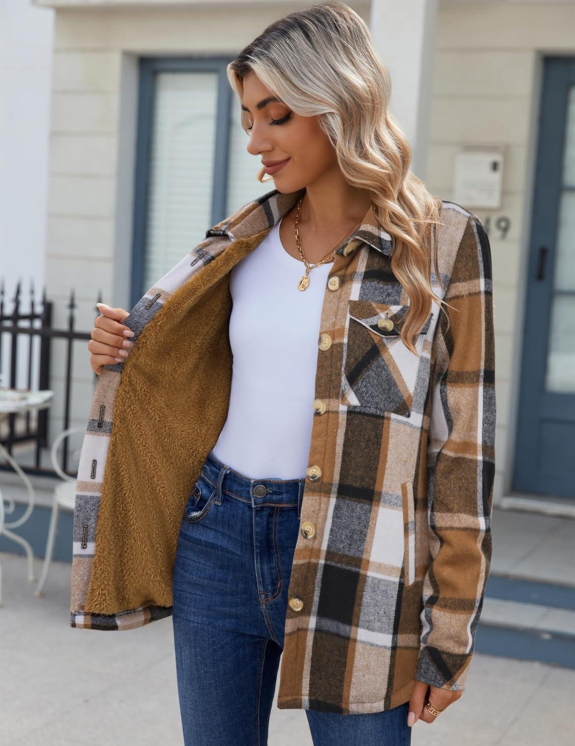 Zeagoo Women’s Fleece Sherpa Jacket Casual Long Sleeve Button Down Flannel Shacket Shirt Winter Coat with Pockets(Brown White)