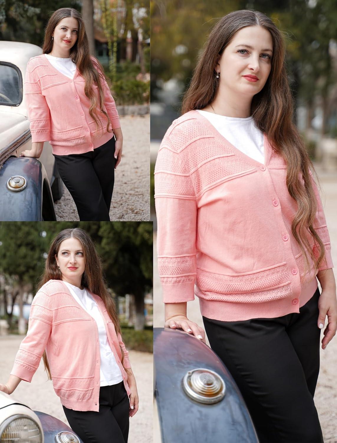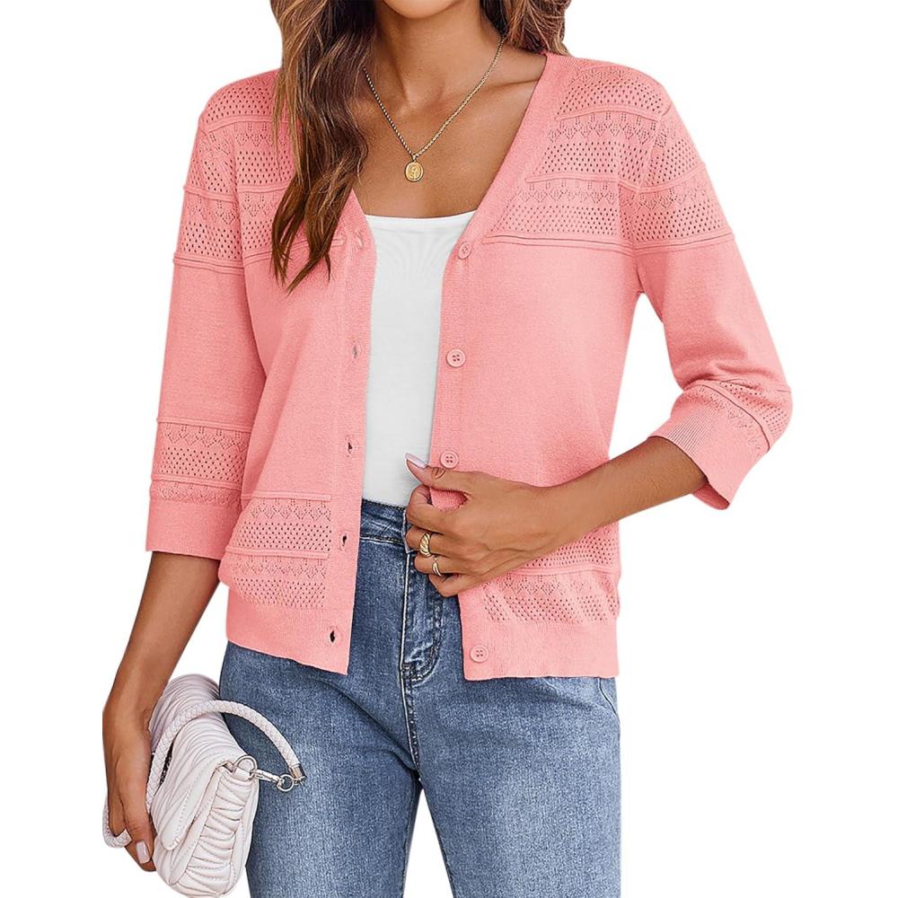 Zeagoo Womens Lightweight Summer Cropped Cardigan 3/4 Sleeve Button up Thin Bolero Crochet Knit Shrug Sweater(Pink)