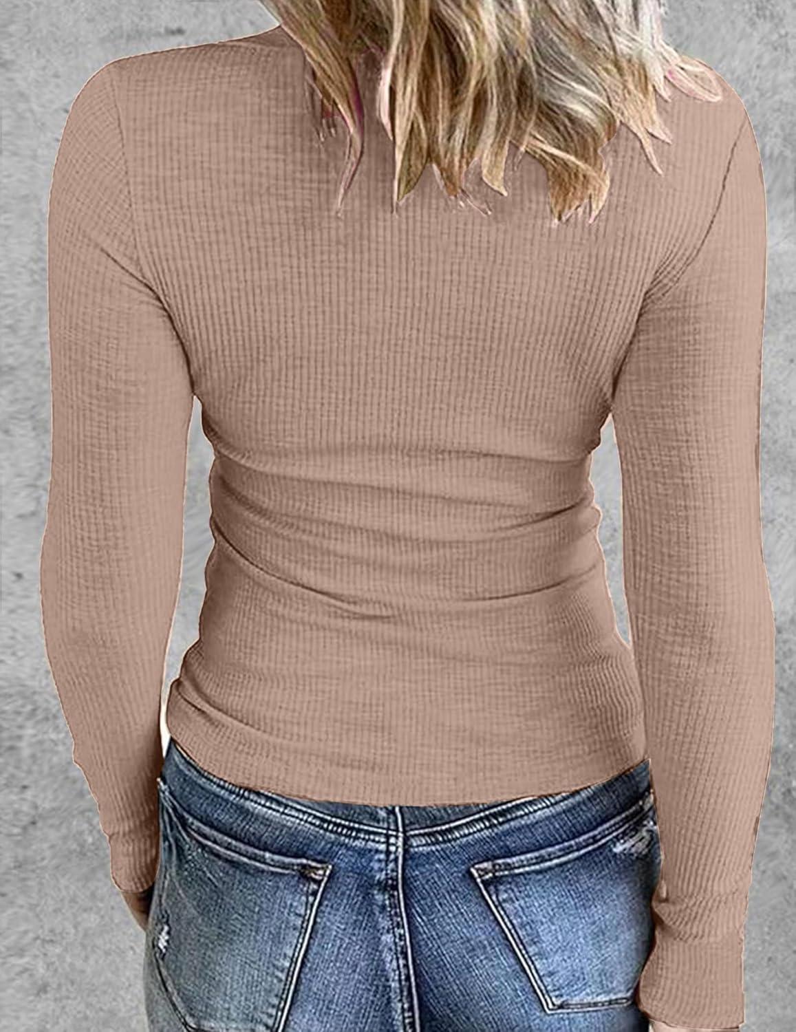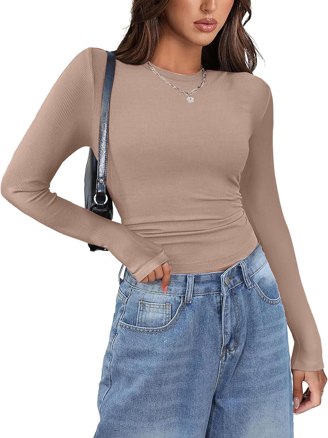 Zeagoo Womens Long Sleeve Stretch Crewneck Ribbed T-Shirt Slim Fit Casual Basic Tops S-XXL(Light Khaki)