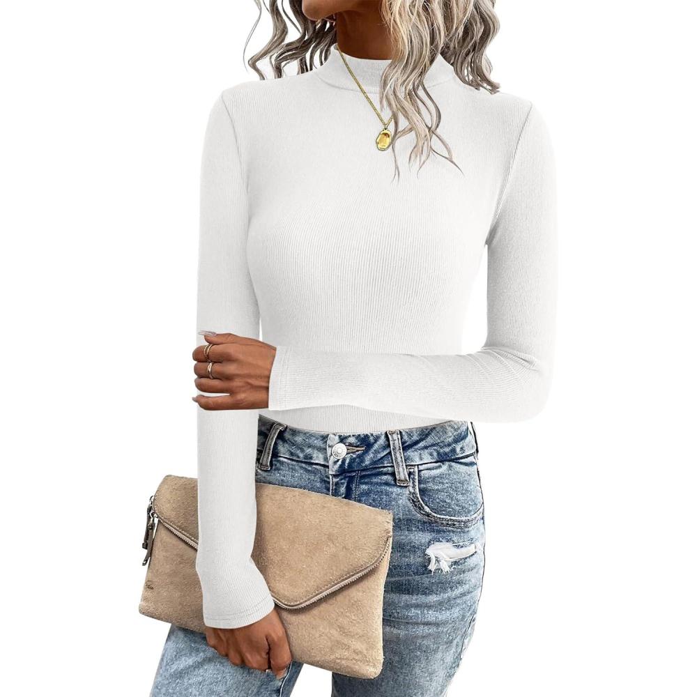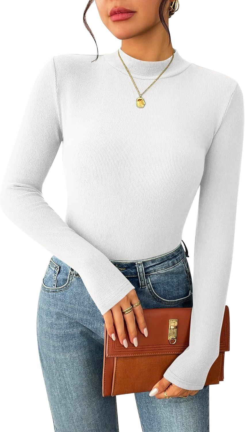 Zeagoo Women’s Long Sleeve Stretch Shirts Mock Neck Ribbed T-Shirt Fitted Casual Basic Tops 2024(White)