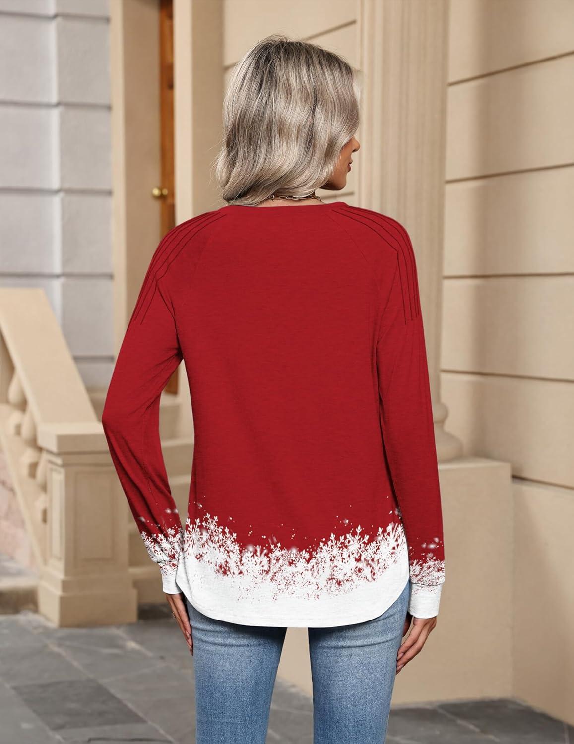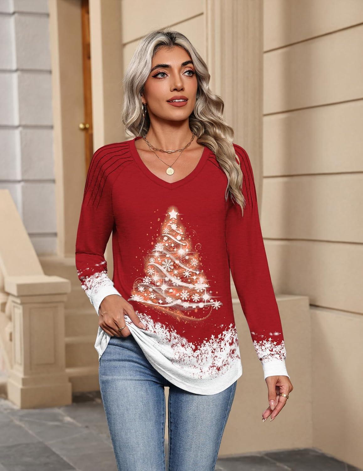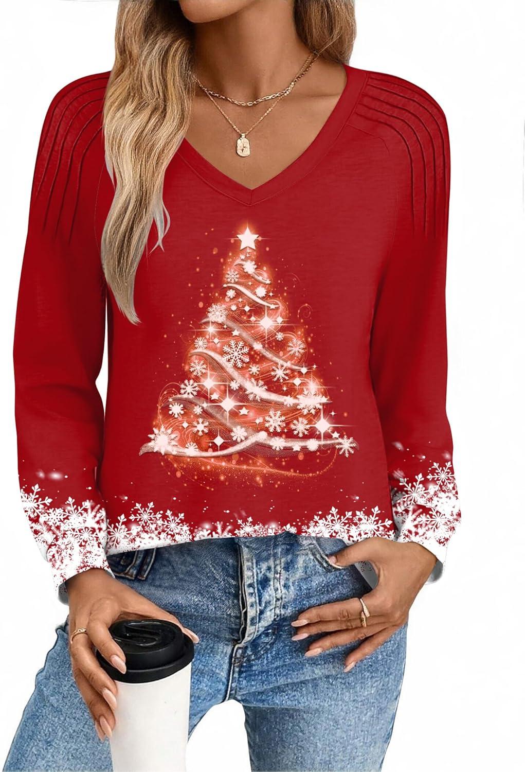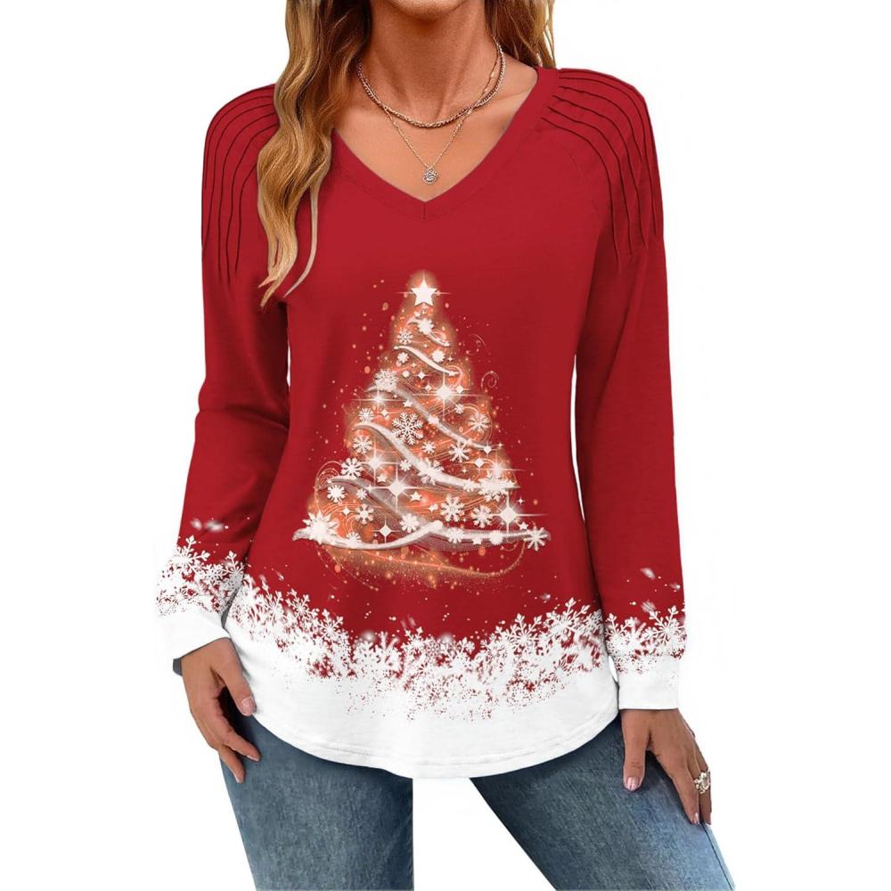 Zeagoo Womens Long Sleeve Tops V Neck Pleated Shirts Dressy Casual Blouses Fall Fashion Tunic Clothes 2025 T-Shirts(01-floral Christmas 1)