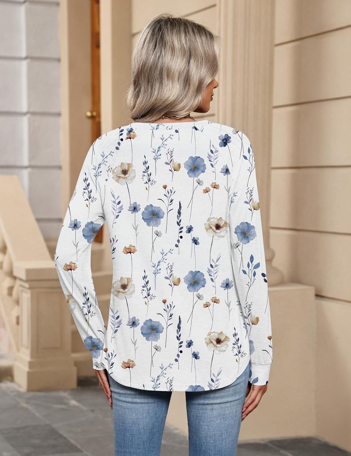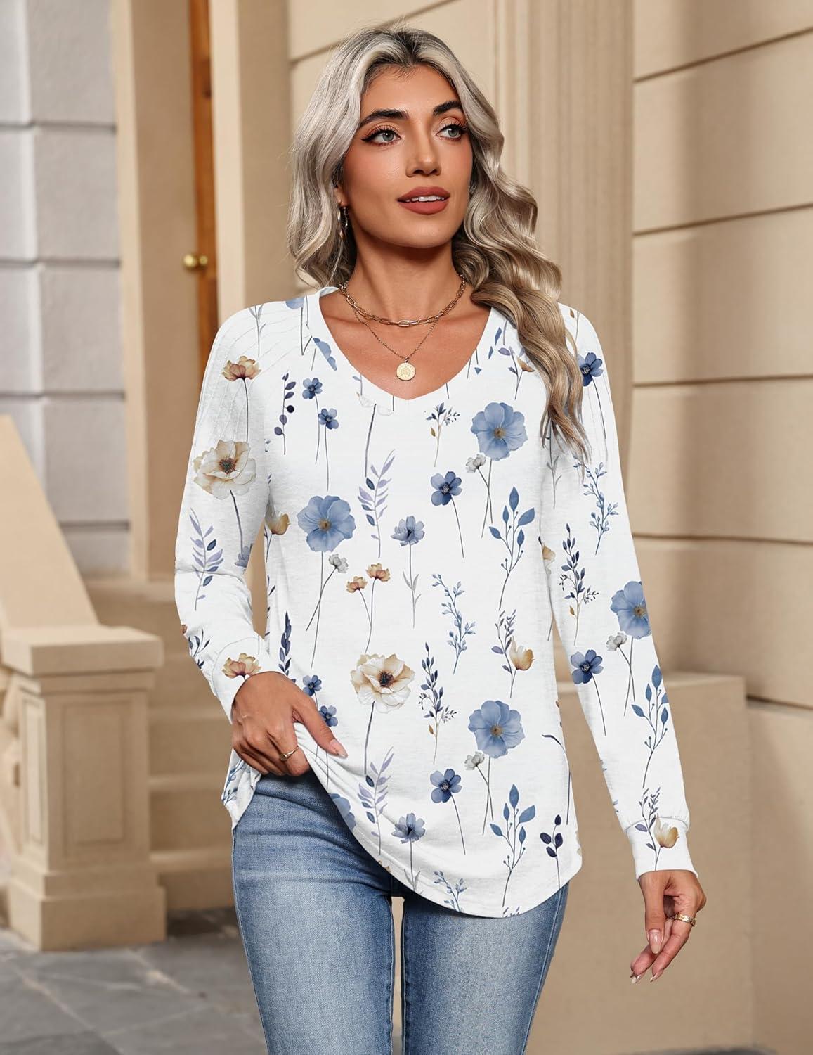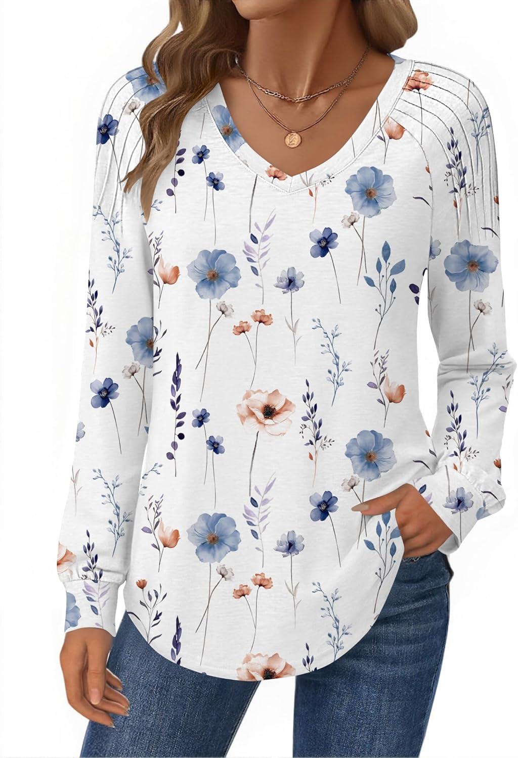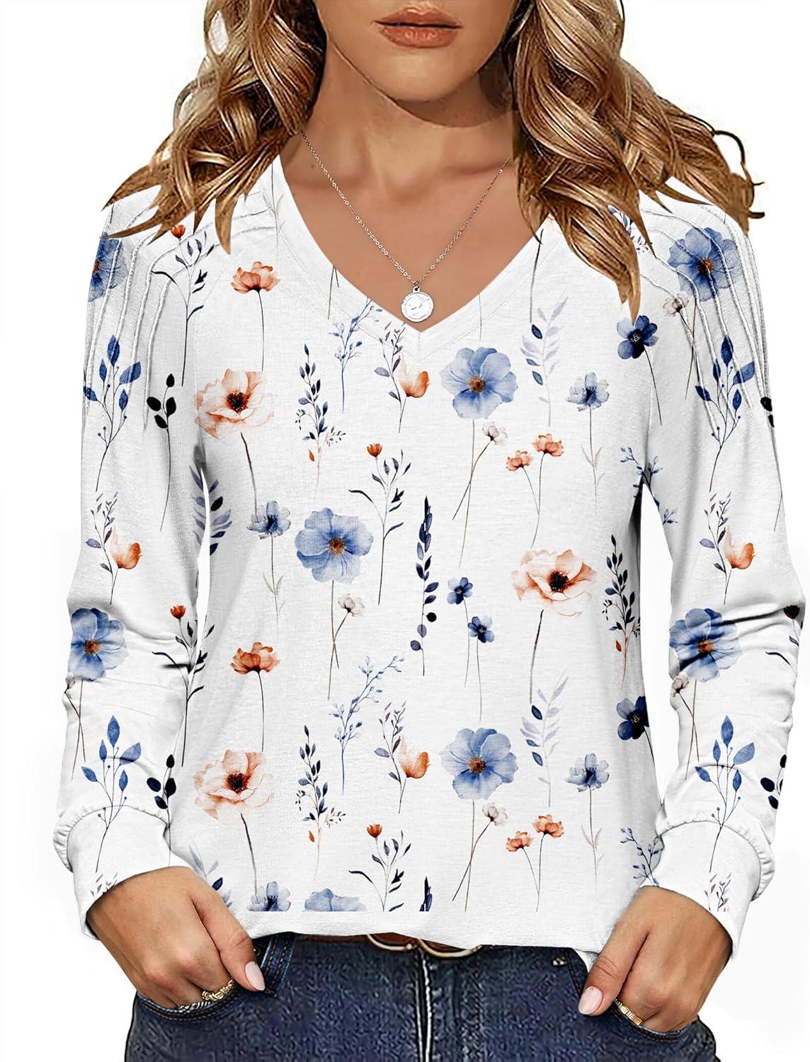 Zeagoo Womens Long Sleeve Tops V Neck Pleated Shirts Dressy Casual Blouses Fall Fashion Tunic Clothes 2025 T-Shirts(01-white Floral)