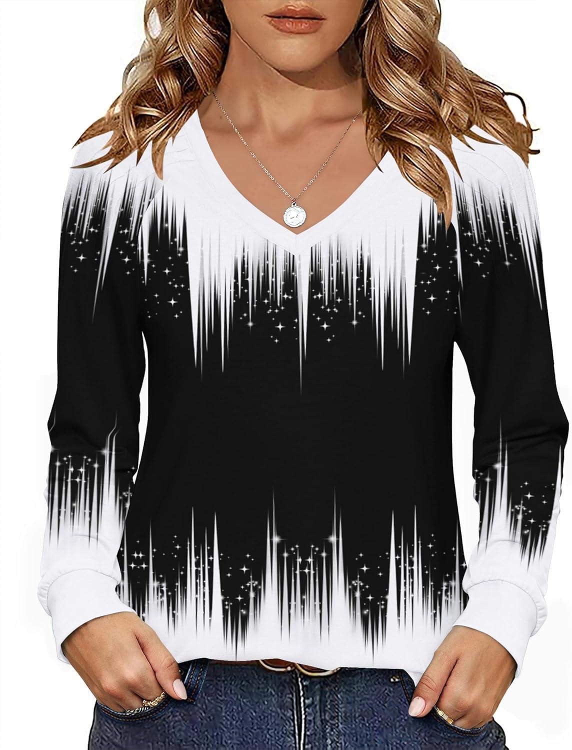 Zeagoo Womens Long Sleeve Tops V Neck Pleated Shirts Dressy Casual Blouses Fall Fashion Tunic Clothes 2025 T-Shirts(Black-white)