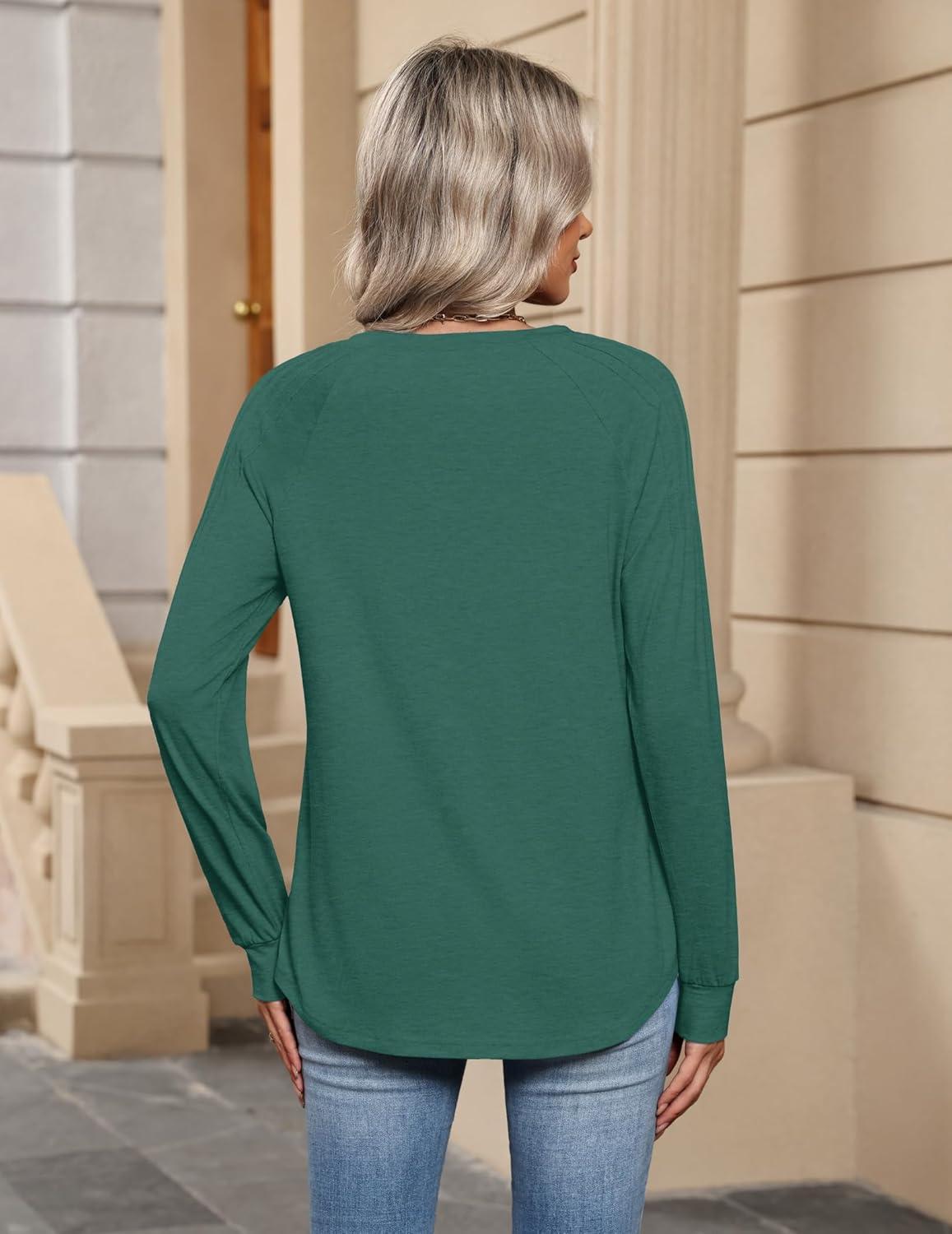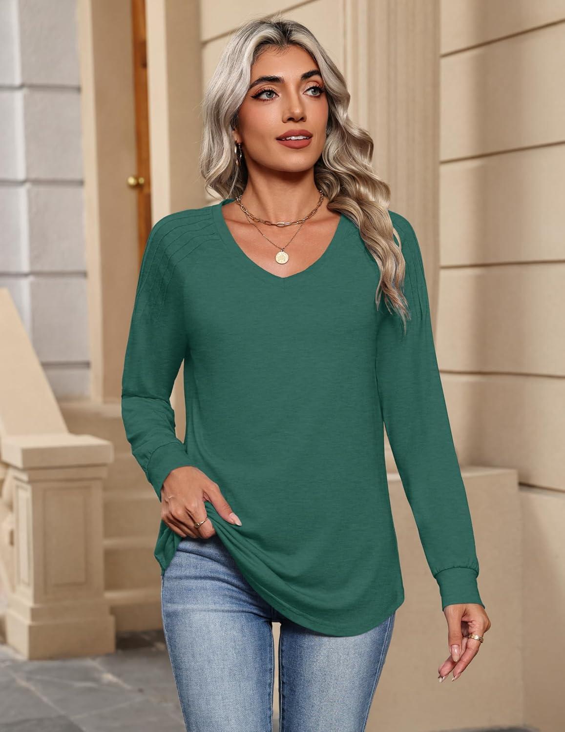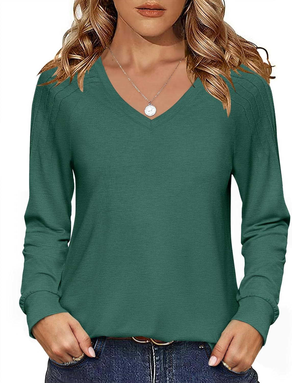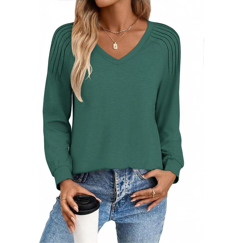 Zeagoo Womens Long Sleeve Tops V Neck Pleated Shirts Dressy Casual Blouses Fall Fashion Tunic Clothes 2025 T-Shirts(Green)