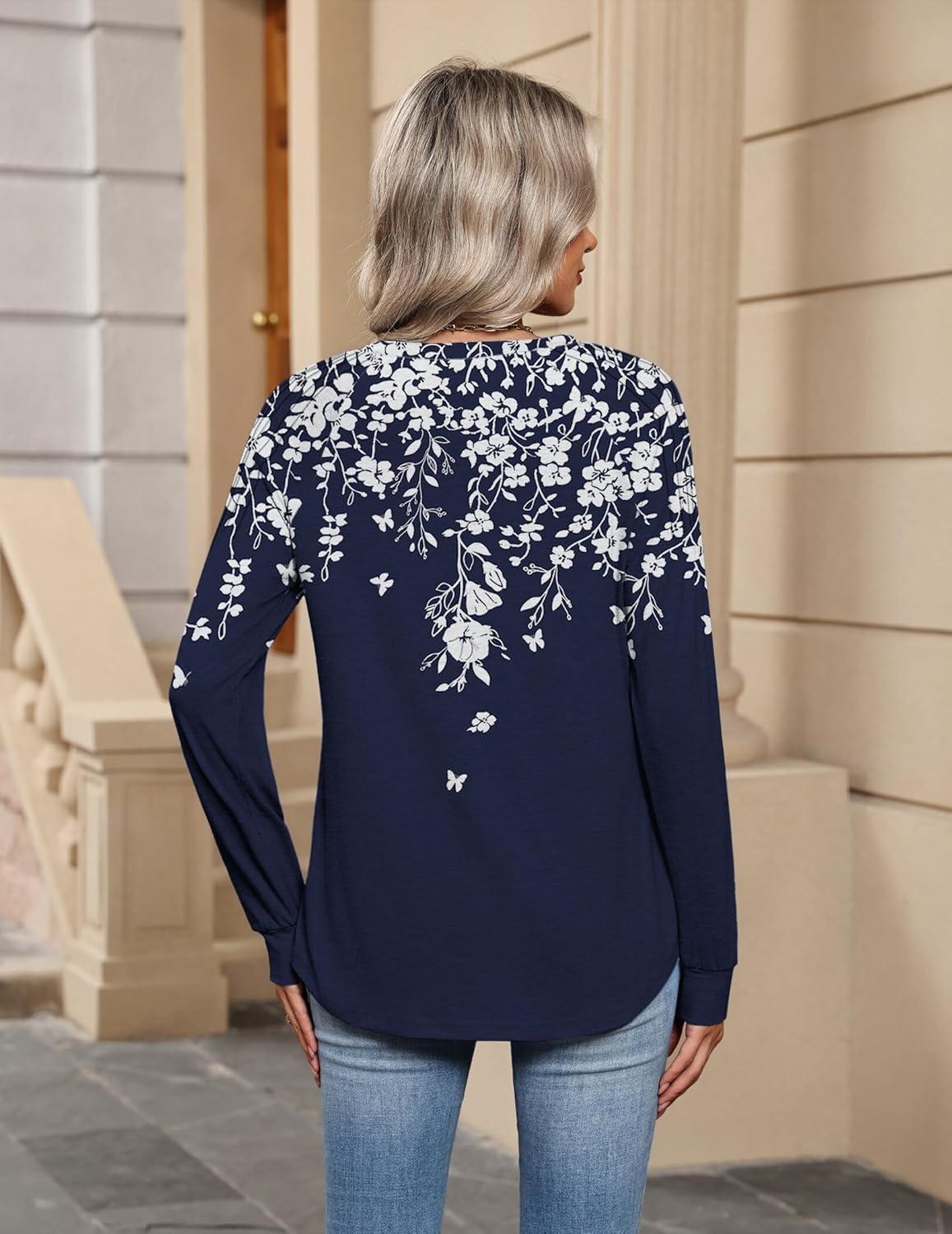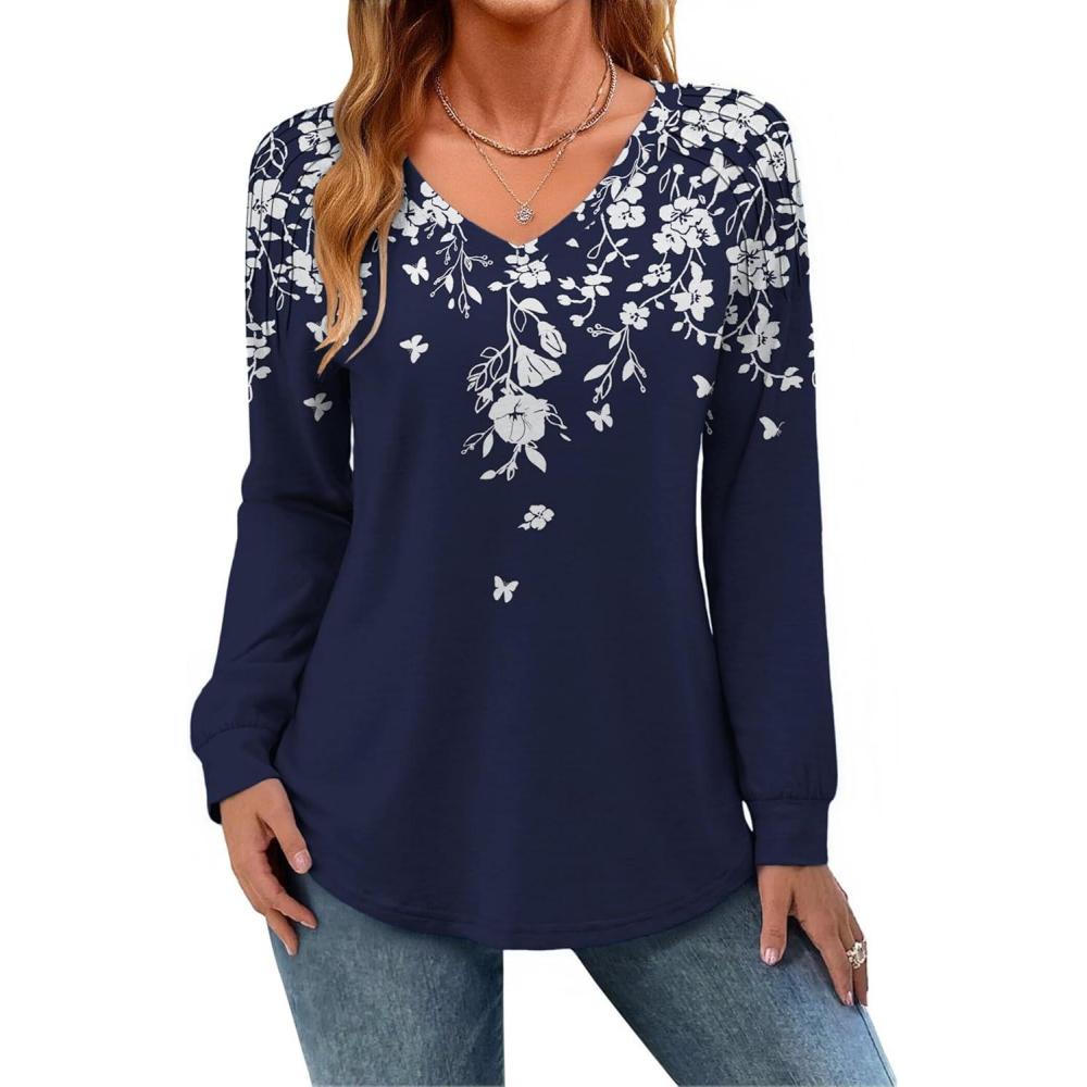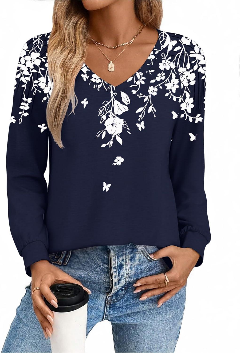 Zeagoo Womens Long Sleeve Tops V Neck Pleated Shirts Dressy Casual Blouses Fall Fashion Tunic Clothes 2025 T-Shirts(Navy Floral)