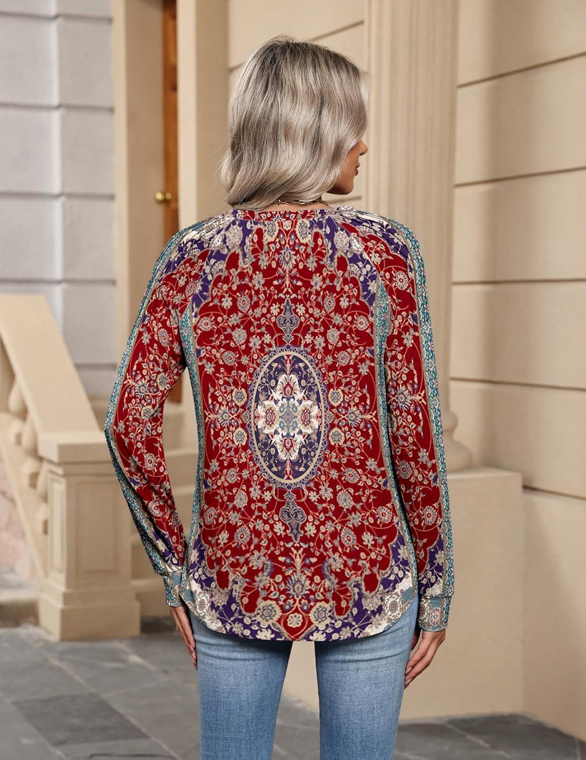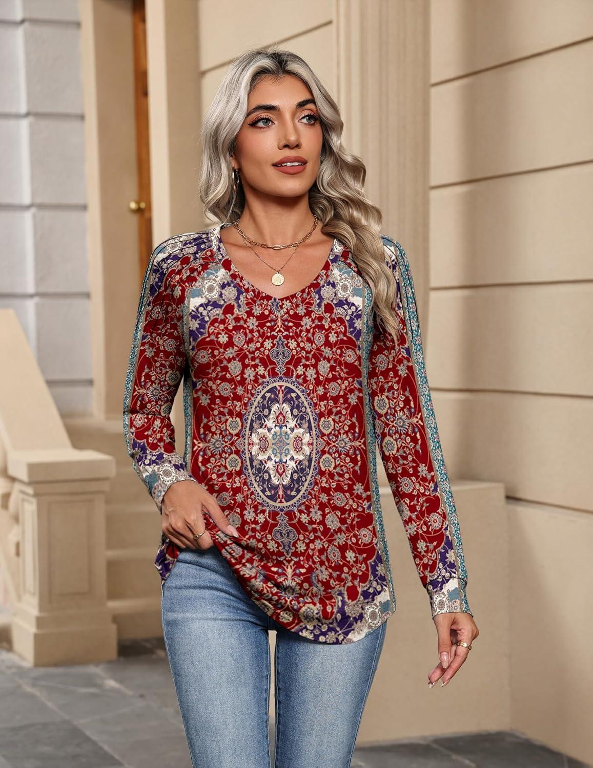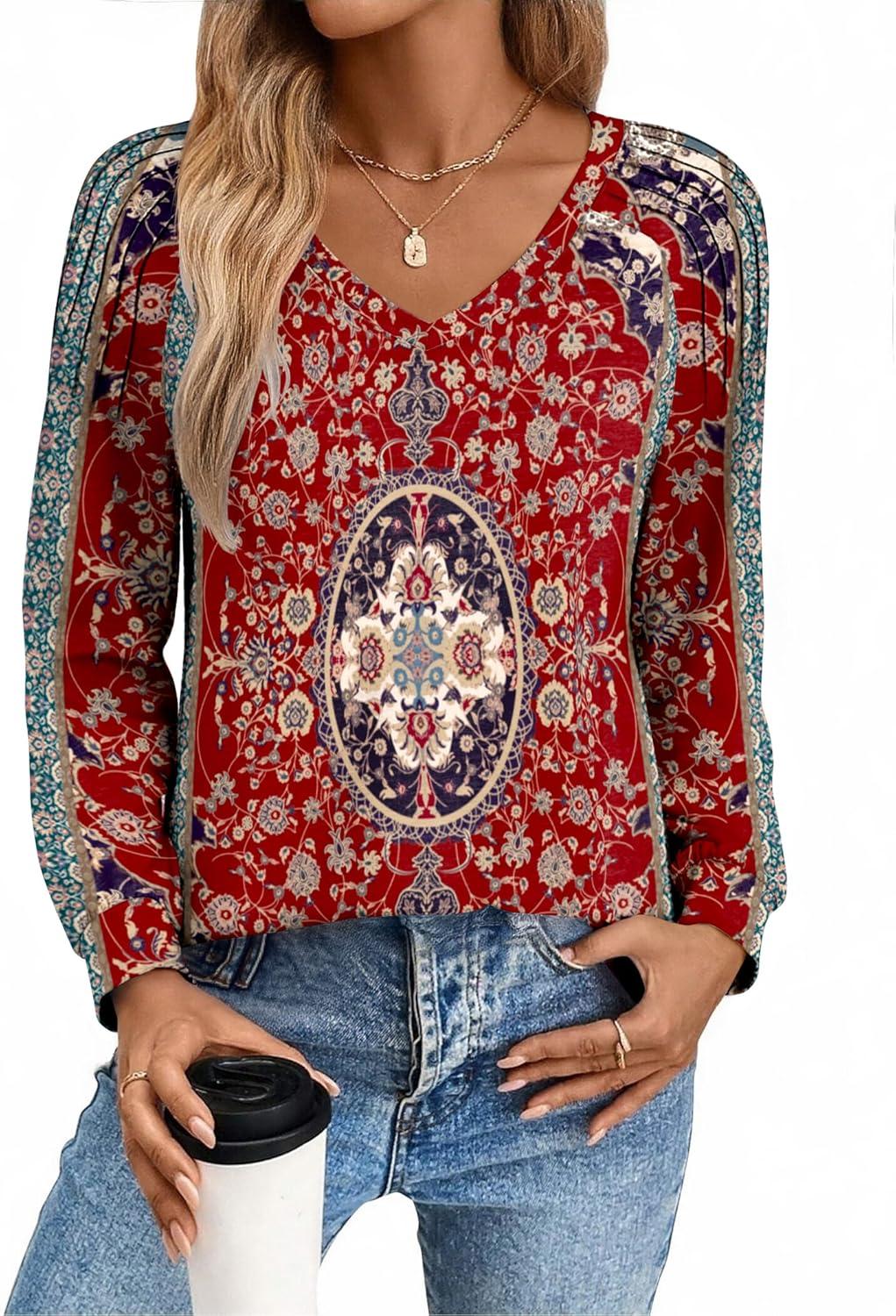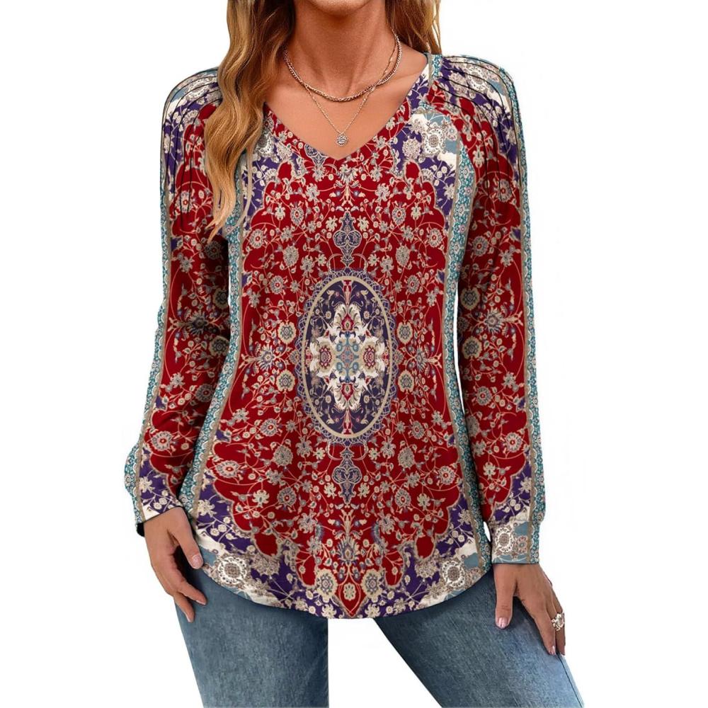 Zeagoo Womens Long Sleeve Tops V Neck Pleated Shirts Dressy Casual Blouses Fall Fashion Tunic Clothes 2025 T-Shirts(Red Floral)