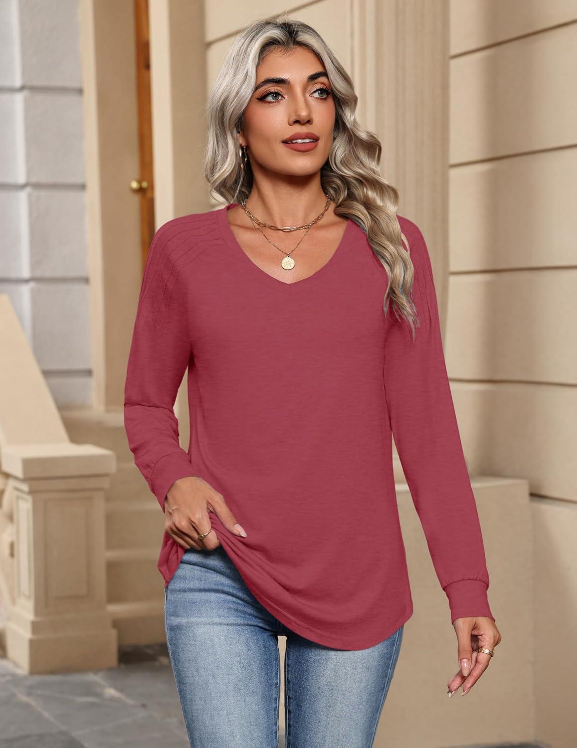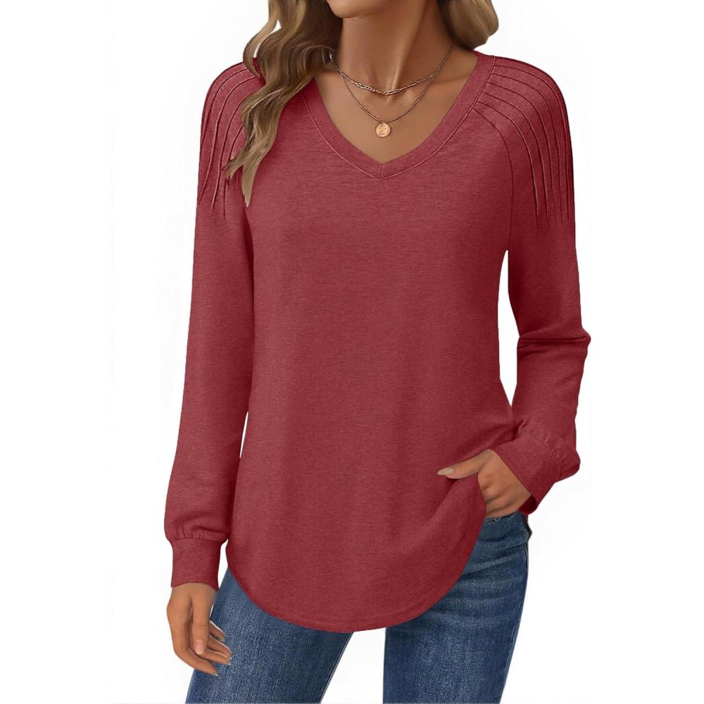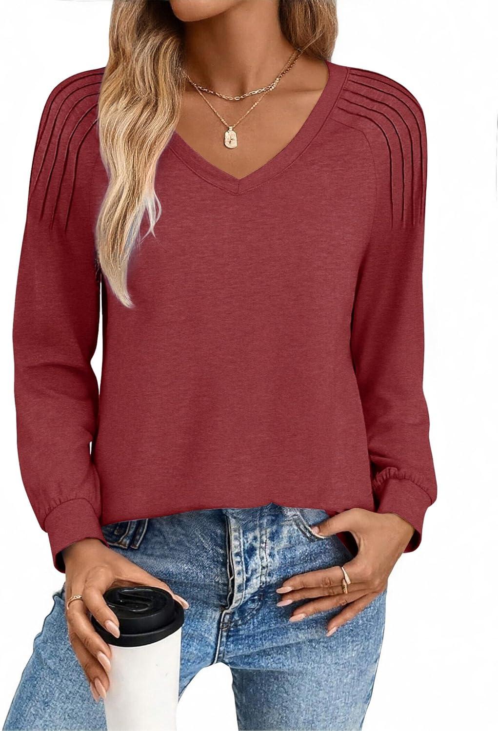 Zeagoo Womens Long Sleeve Tops V Neck Pleated Shirts Dressy Casual Blouses Fall Fashion Tunic Clothes 2025 T-Shirts(Wine Red)