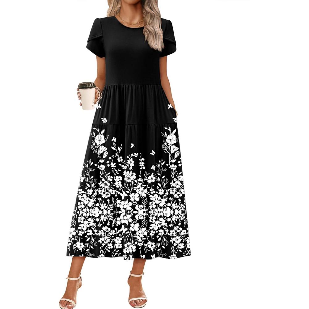 Zeagoo Womens Maxi Dresses Summer Bohemian Floral Short Sleeve Long Dress Casual Flowy Tired Beach Sundress(Sf100)