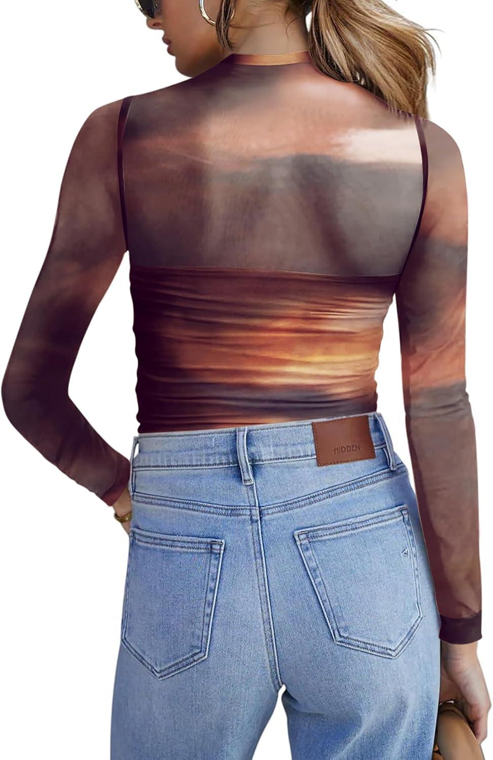Zeagoo Womens Mesh Sheer Long Sleeve Top Mock Turtle Neck See Though Shirts Ruched Sexy Casual Going Out Blouses(Tie Dye Print)