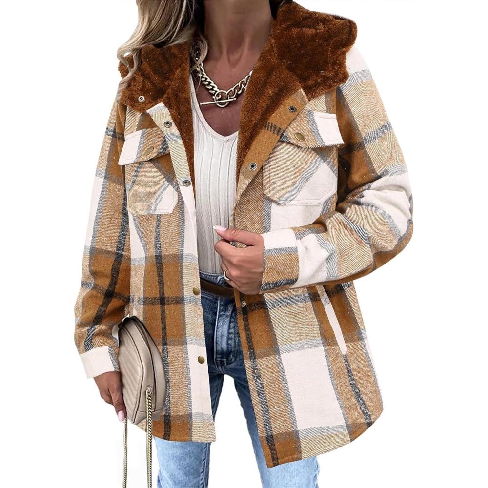 Zeagoo Womens Plaid Shacket Jacket Long Sleeve Fleece Hooded Jackets Fall Winter Warm Coat S-2XL(Brown)