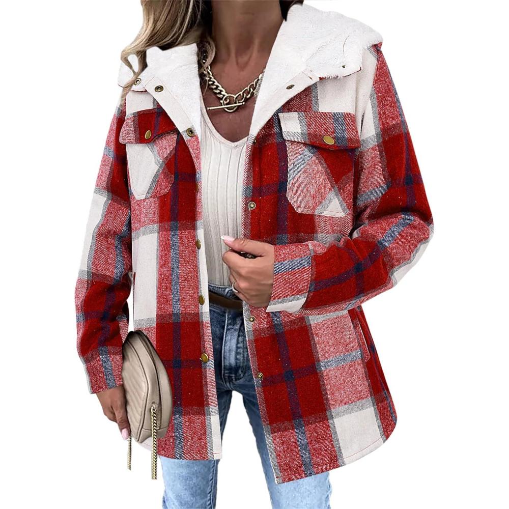 Zeagoo Womens Plaid Shacket Jacket Long Sleeve Fleece Hooded Jackets Fall Winter Warm Coat S-2XL(Wine Red)