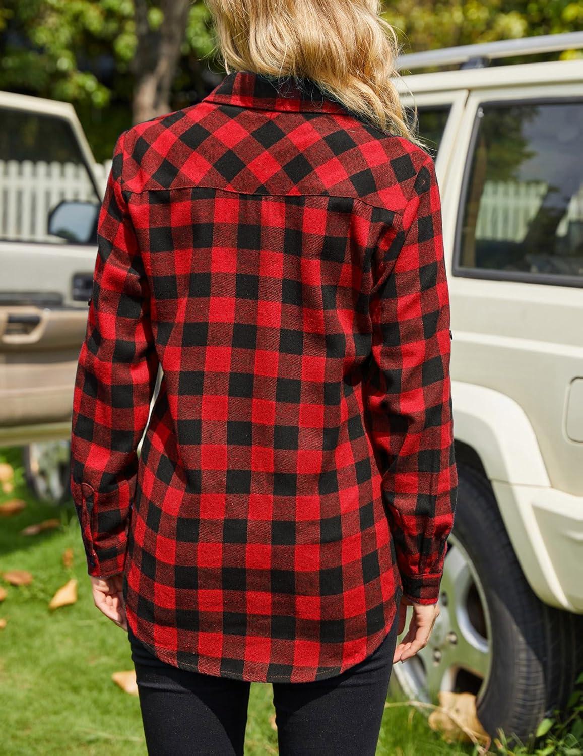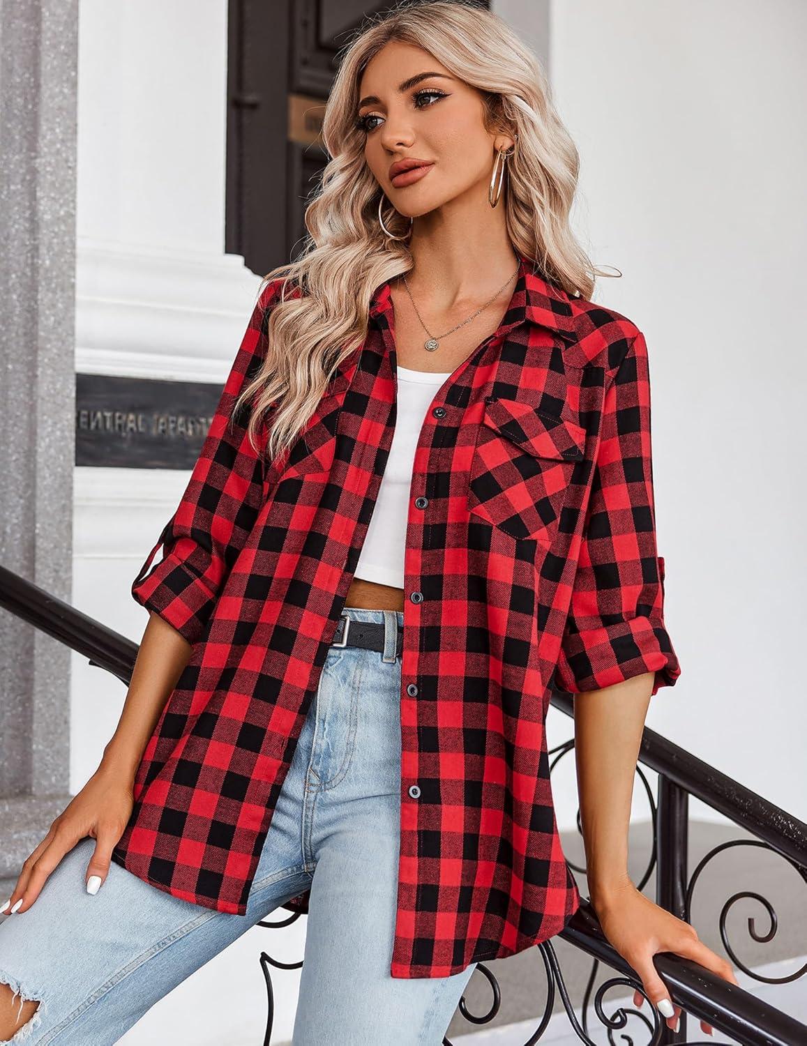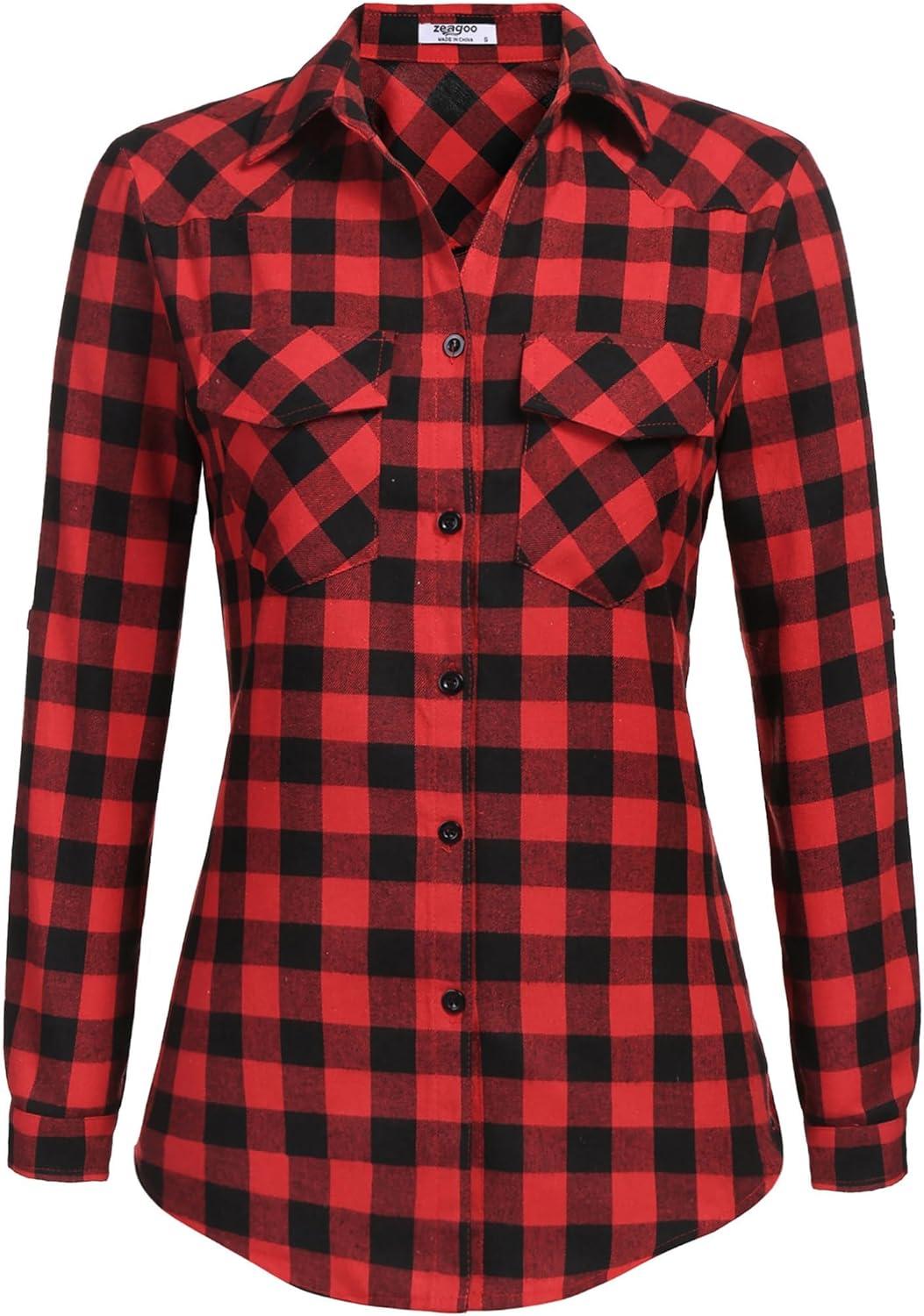 Zeagoo Womens Plaid Shirt Flannel Shirt Roll up Sleeve Top Casual Button Down Blouse(1-red)