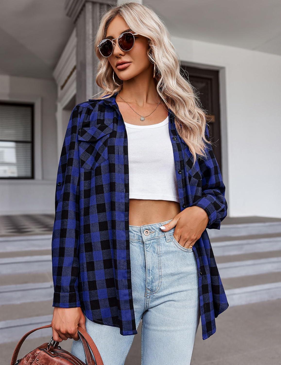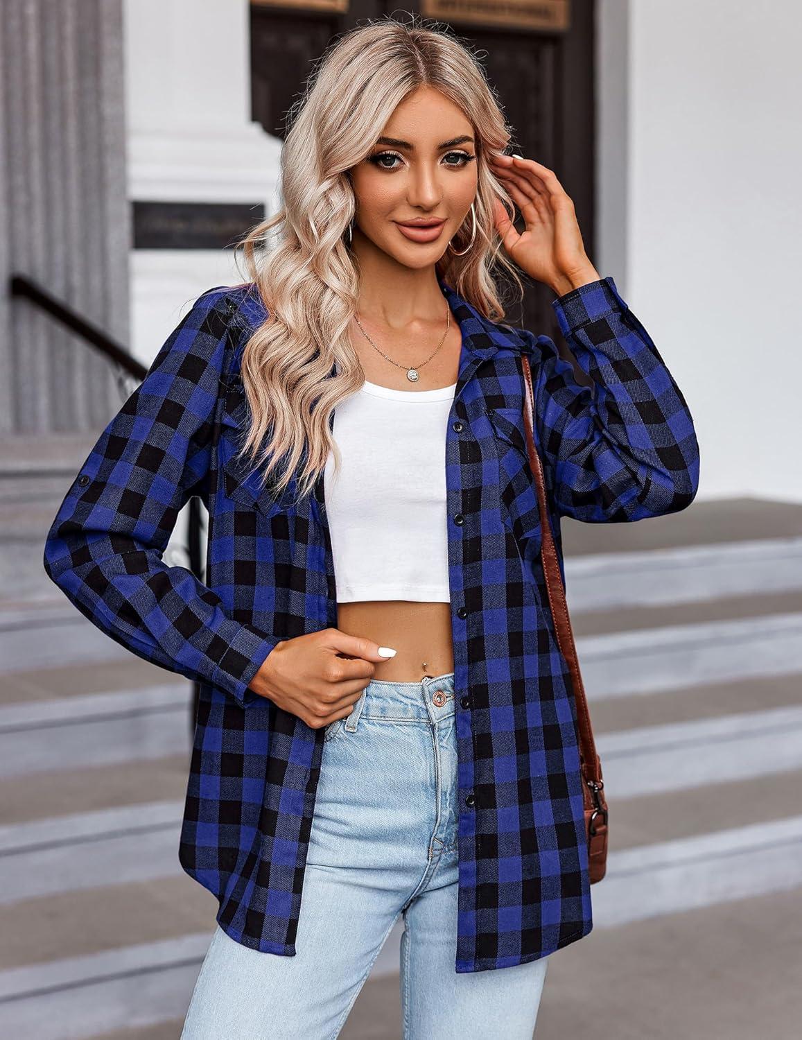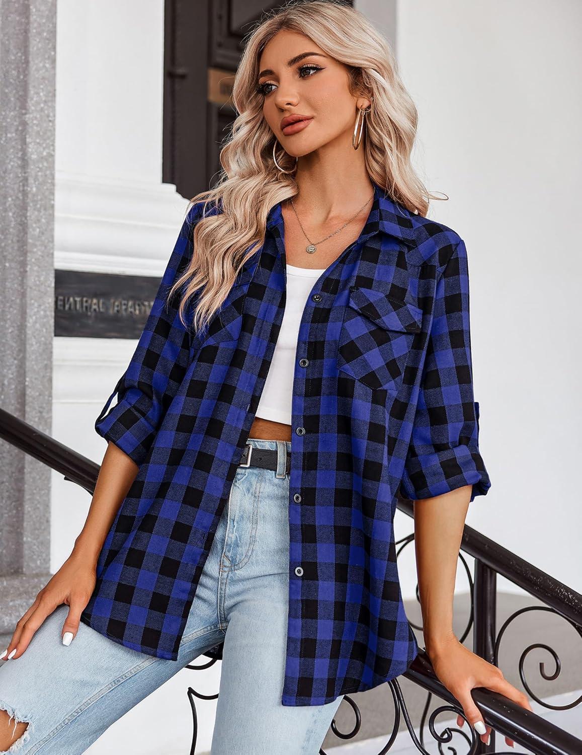 Zeagoo Womens Plaid Shirt Flannel Shirt Roll up Sleeve Top Casual Button Down Blouse(Blue1)