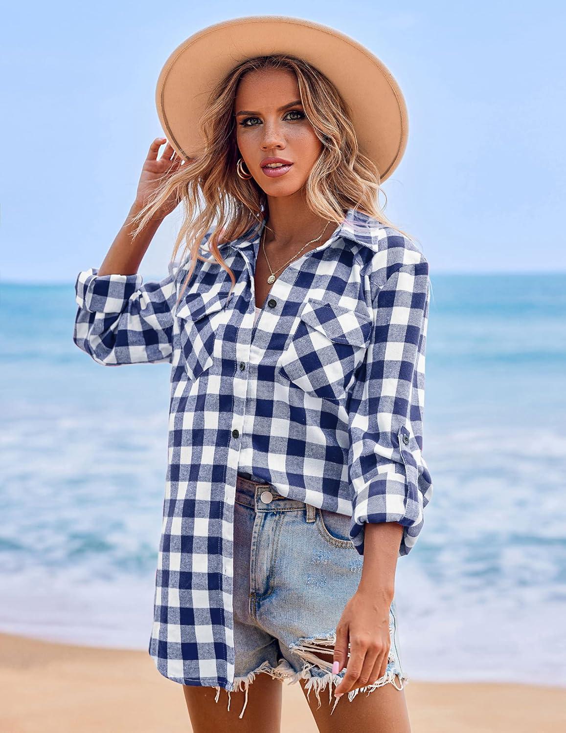 Zeagoo Womens Plaid Shirt Flannel Shirt Roll up Sleeve Top Casual Button Down Blouse(Dark Blue)