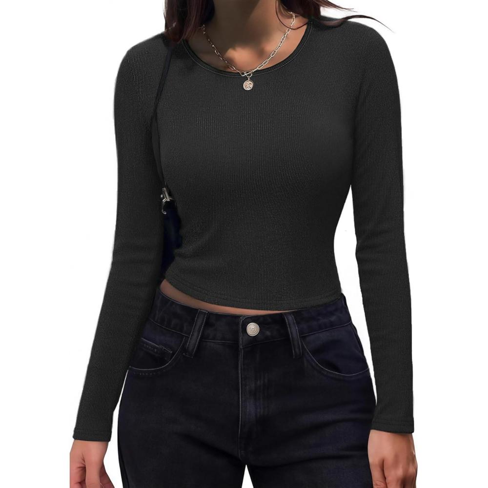 Zeagoo Womens Ribbed Fitted Crop Tops Long Sleeve T Shirts Basic Scoop Neck Casual Slim Fitted Y2k Clothes 2025(01 Black)