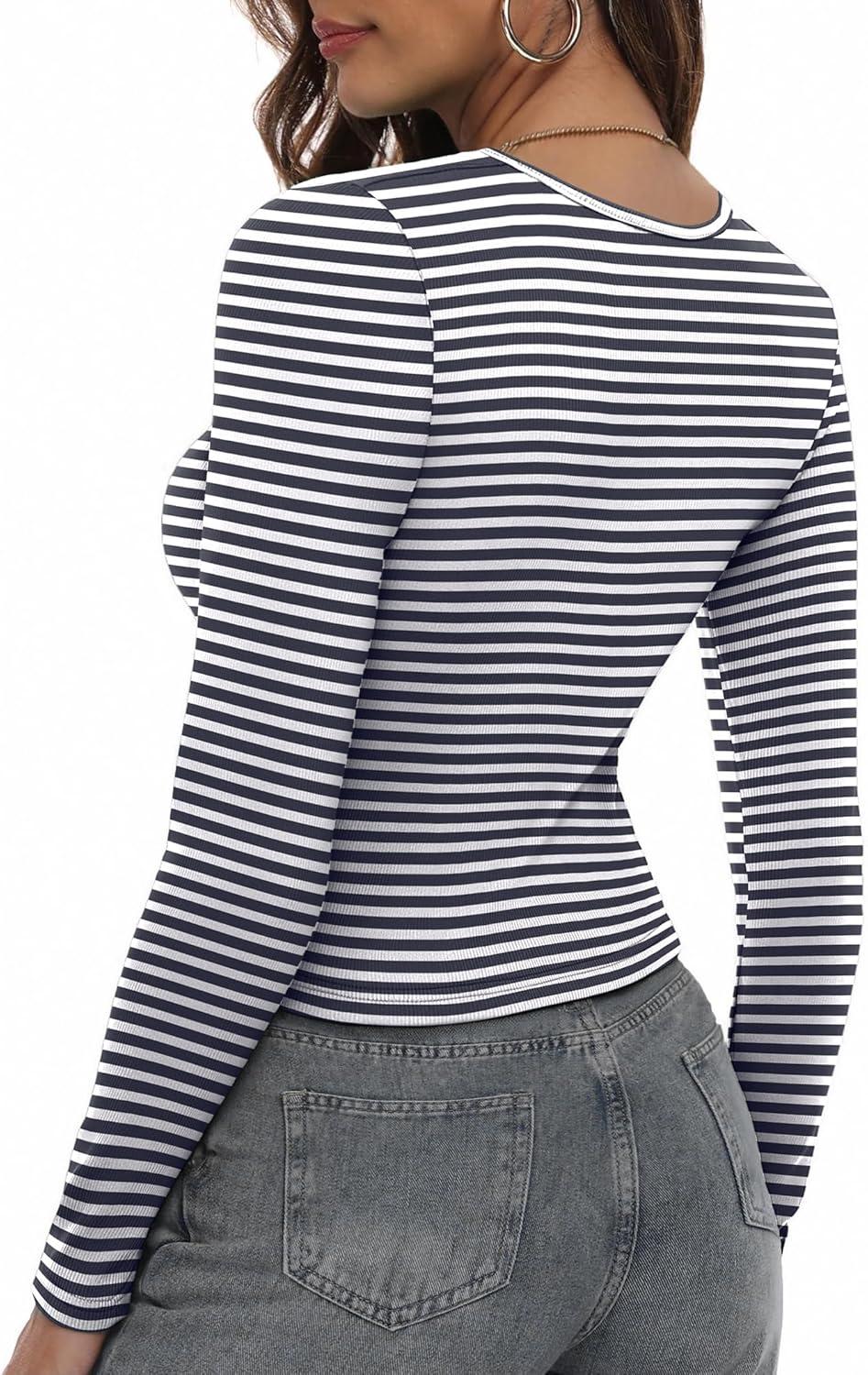 Zeagoo Womens Ribbed Fitted Crop Tops Long Sleeve T Shirts Basic Scoop Neck Casual Slim Fitted Y2k Clothes 2025(Black Navy Stripe)
