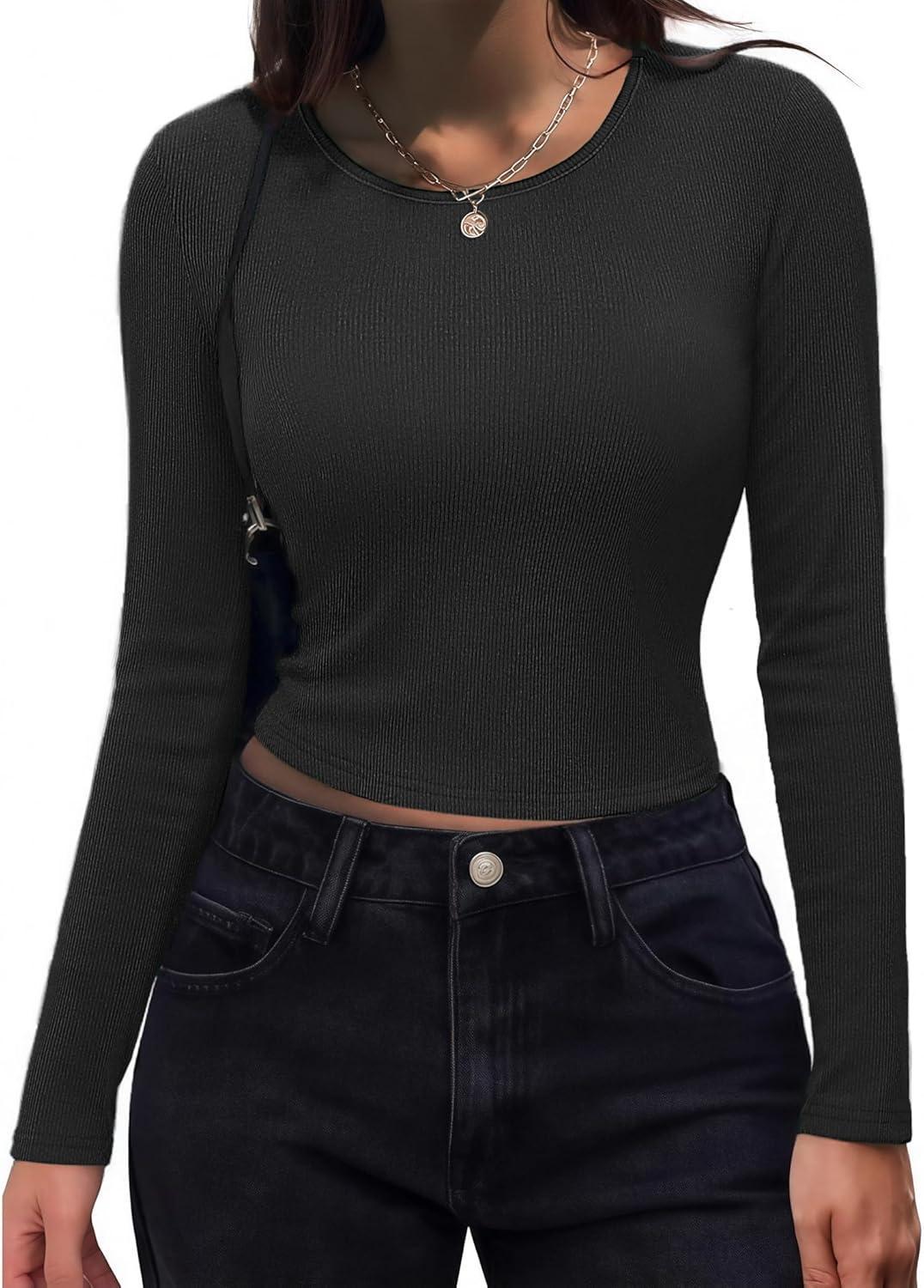 Zeagoo Womens Ribbed Fitted Crop Tops Long Sleeve T Shirts Basic Scoop Neck Casual Slim Fitted Y2k Clothes 2025(Black brown)