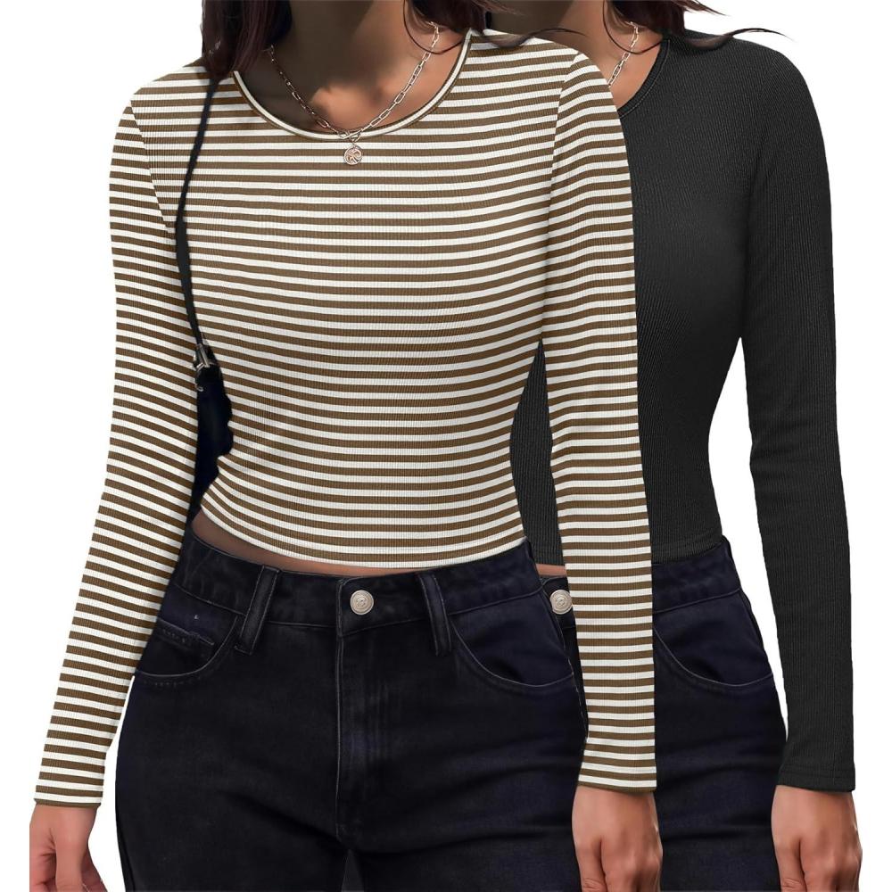 Zeagoo Womens Ribbed Fitted Crop Tops Long Sleeve T Shirts Basic Scoop Neck Casual Slim Fitted Y2k Clothes 2025(Black white Brown Stripe)
