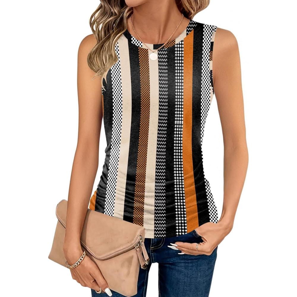Zeagoo Womens Ruched Tank Tops Summer Dressy Casual Crewneck Sleeveless Shirts S-XXL(Black White Orange Khaki Stripe)