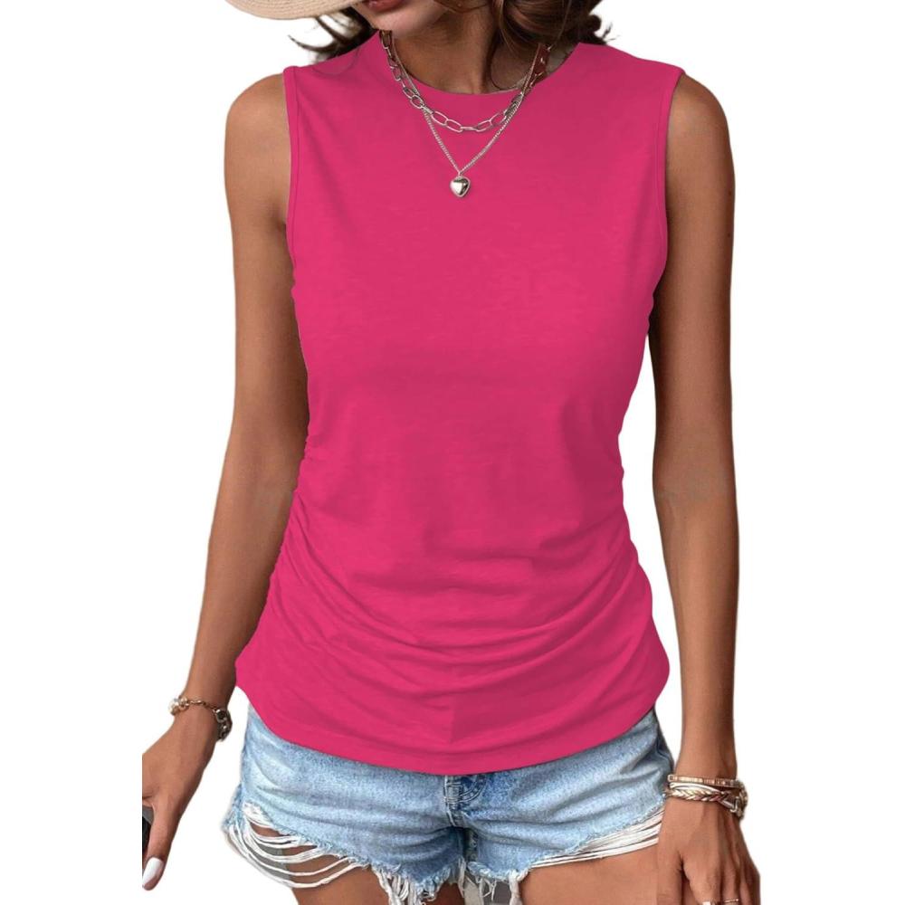 Zeagoo Womens Ruched Tank Tops Summer Dressy Casual Crewneck Sleeveless Shirts S-XXL(Hot Pink)