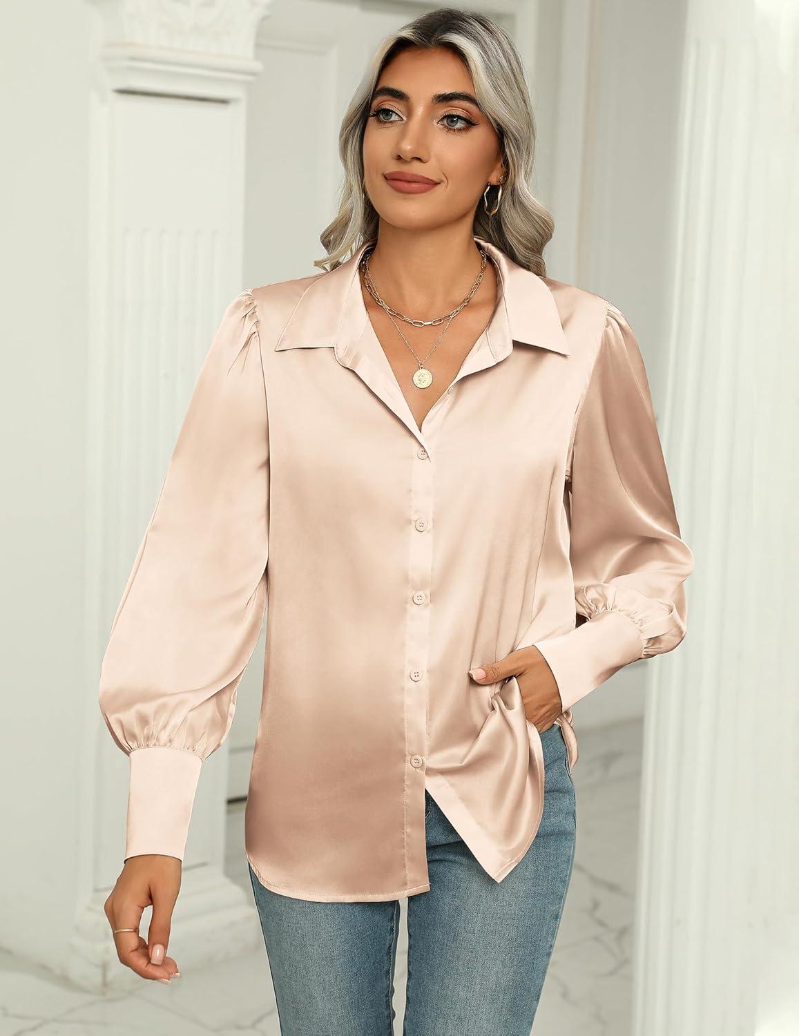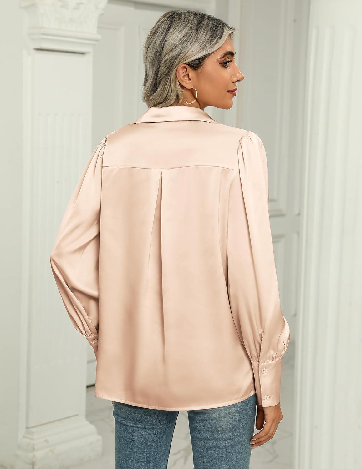 Zeagoo Womens Satin Blouse Lantern Long Sleeve Silk Button Down Shirt Dressy Casual Business Work Tunic Tops(Hot Pink)