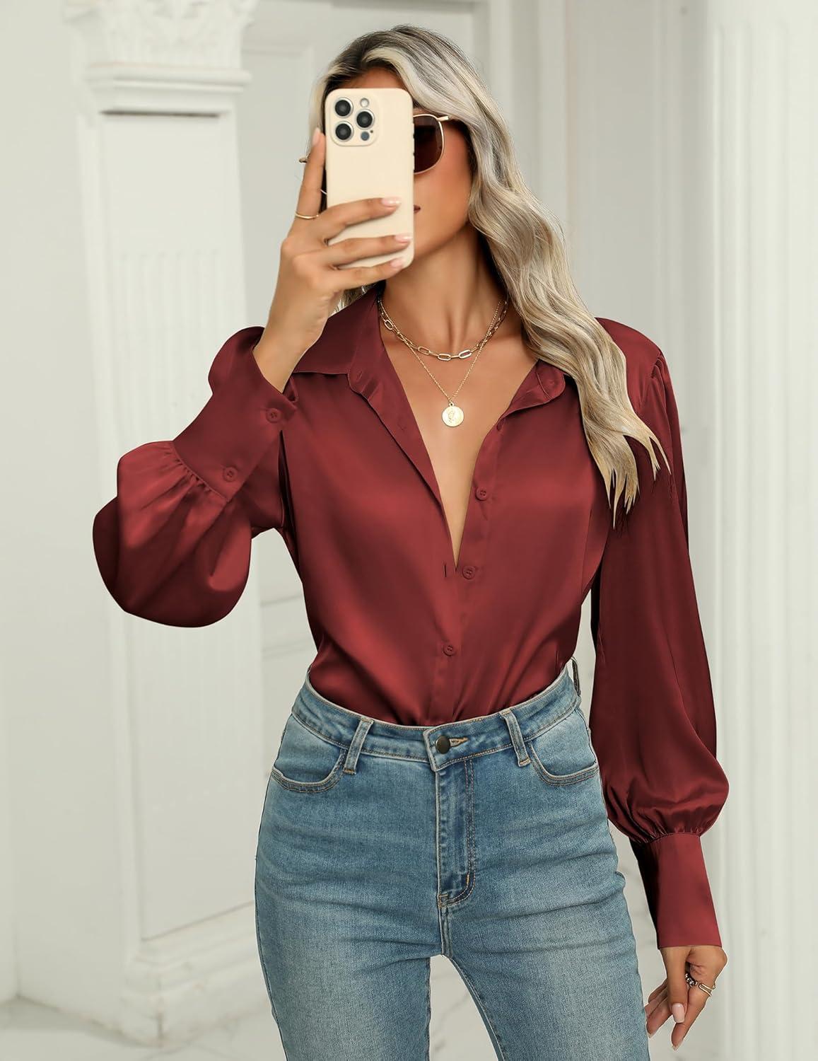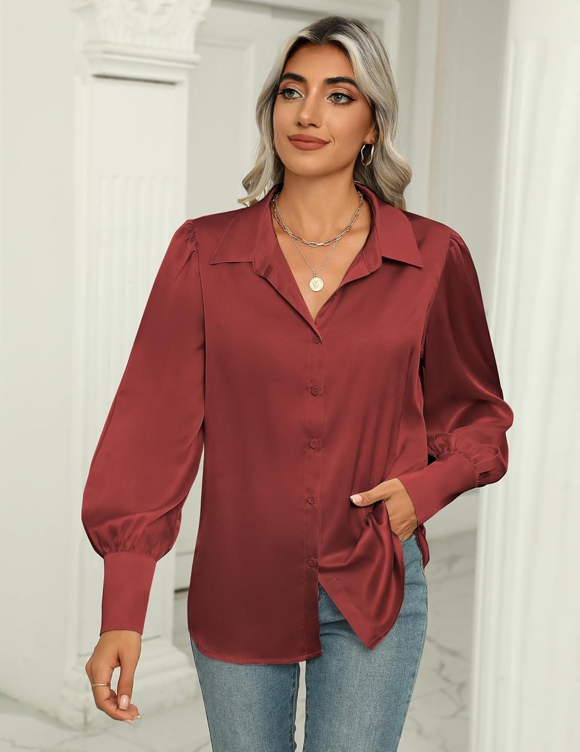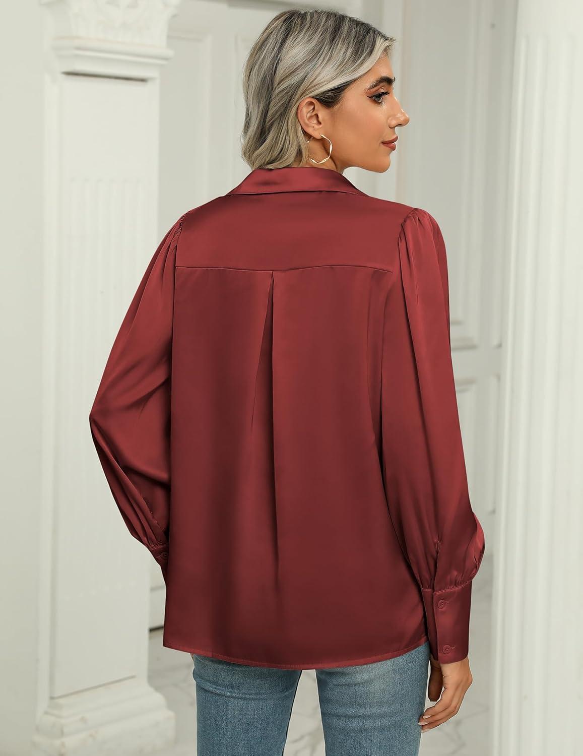 Zeagoo Womens Satin Blouse Lantern Long Sleeve Silk Button Down Shirt Dressy Casual Business Work Tunic Tops(Wine Red)
