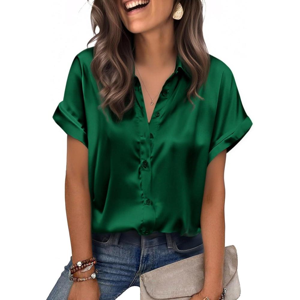 Zeagoo Womens Satin Blouse Short Sleeve Silk Tops Button Down Shirts Business Casual Outfits(Green)