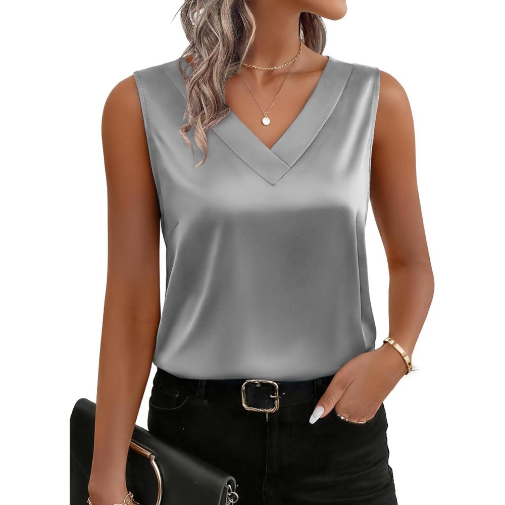 Zeagoo Women’s Silk Satin Tank Tops V Neck Casual Camisoles Sleeveless Business Work Blouses Dressy Summer Shirts(Grey)