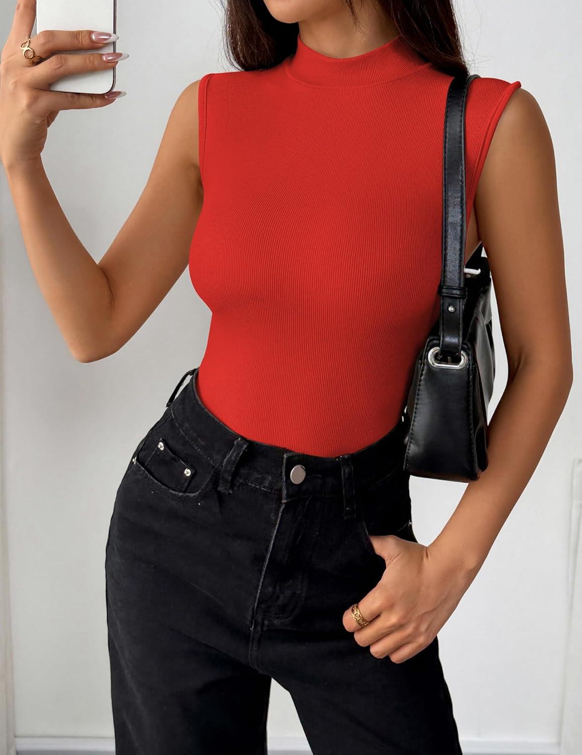 Zeagoo Womens Sleeveless Mock Turtleneck Tank Tops Slim Fit Stretch Ribbed Tops Casual Basic Layering Shirts 2025(Red)