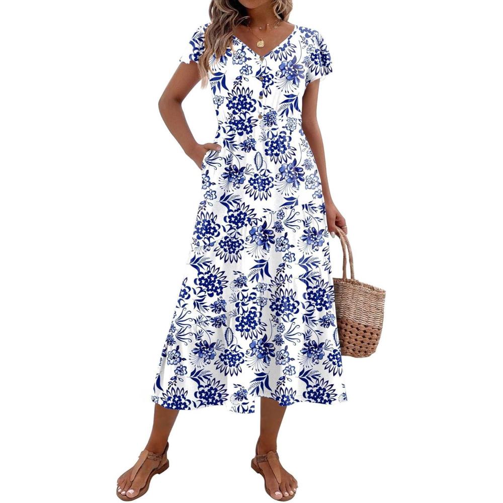 Zeagoo Women’s Summer Casual Dress Flutter Short Sleeve V Neck Button Down Tiered Flowy Long Dress with Pockets(Floral-bf157)
