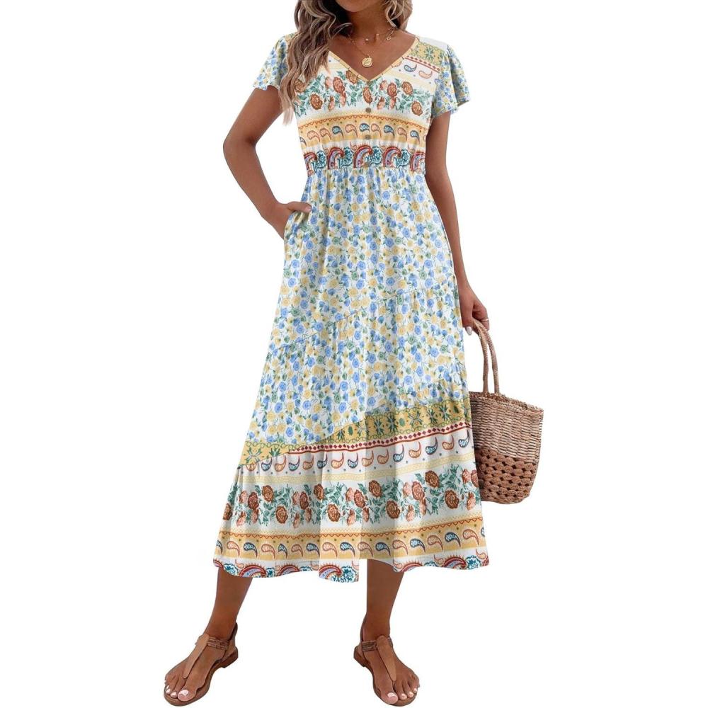Zeagoo Women’s Summer Casual Dress Flutter Short Sleeve V Neck Button Down Tiered Flowy Long Dress with Pockets(Floral-xh446)